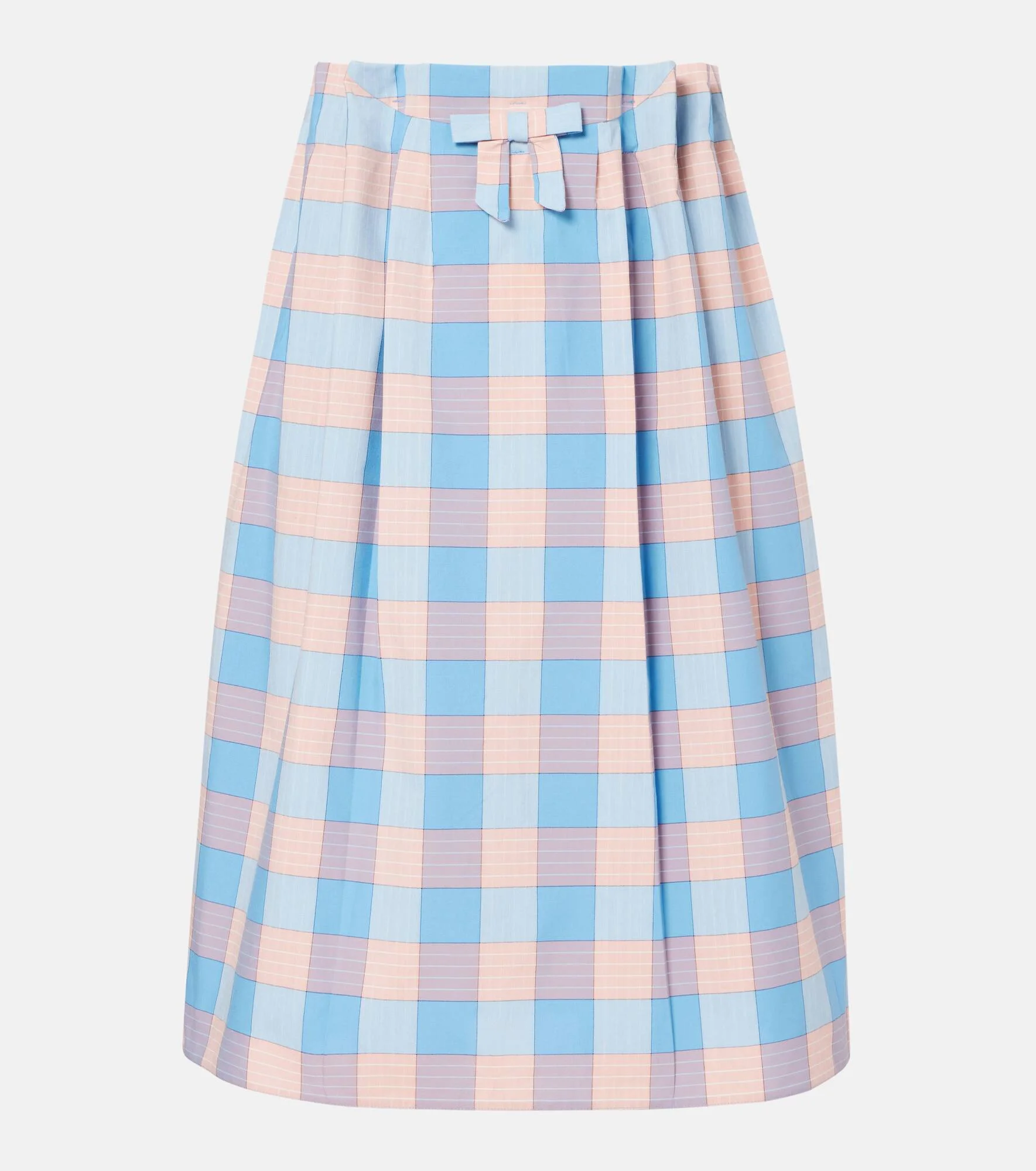 Prada takes Italian heritage into a distinctly modern direction with a streamlined and fashion-forward approach. Made from breathable cotton poplin, this midi skirt is complete with a charming bow detail and an elegant checked pattern. Product Details - Material: 100% cotton - Care instructions: dry clean - Made in Italy - Designer color name: Pink - Item color: pink, blue - Adjustable inner tabs at the waist - Elasticated waistband - Pockets: side slit pockets - Item number: P01101397 Size & Fit - True to size - Elasticated waist - Non-stretchy fabric - High-waisted - The model seen in the picture is 178cm-5'10" and wearing a size IT 40