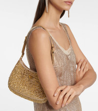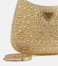 Prada's Cleo Small shoulder bag is a modern interpretation of a style from the brand's archives. This iteration is made from satin, covered in sparkly crystals of various sizes, and finished with the iconic triangular emblem. Product Details - Top handle, Detachable, adjustable shoulder strap - Internal details: internal slot pocket, satin lining - Designer color name: Platino - Made in Italy - Comes with dust bag - Trim: cow leather - Closure: magnetic-tab fastening - Material: fabric - Comes with a box - Item number: P00736260 Size & Fit - Height 15cm-6" - Width 22cm-8.5" - Max. depth 3,5cm-1.5" - Min. length of handles 40cm-15.5" - Max. length of handles 50cm-19.5" - Min. length shoulder strap 104cm-41" - Max. length shoulder strap 114cm-45"