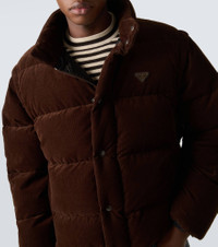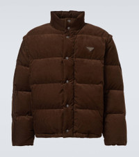 This insulating down jacket from Prada showcases a soft cotton corduroy construction. The medium-weight design stands out with the signature logo plaque on the chest, and detachable sleeves that allow for convertible styling. Product Details - Material: 100% cotton - Care instructions: hand wash - Made in Romania - Designer color name: Brown - Item color: brown - Filling: 90% down, 10% feathers - Filling II: 100% polyamide - Details: 100% calf leather - Contains non-textile parts of animal origin - Closure: snap-buttoned front - Pockets: zipped pockets - Detachable sleeves - Drawstring at the hem for adjustable fit - Item number: P01129462 Size & Fit - True to size - Straight fit - Adjustable hem - Non-stretchy fabric - Falls below the hip - The model in the picture is 185cm-6'1" and wearing a size L