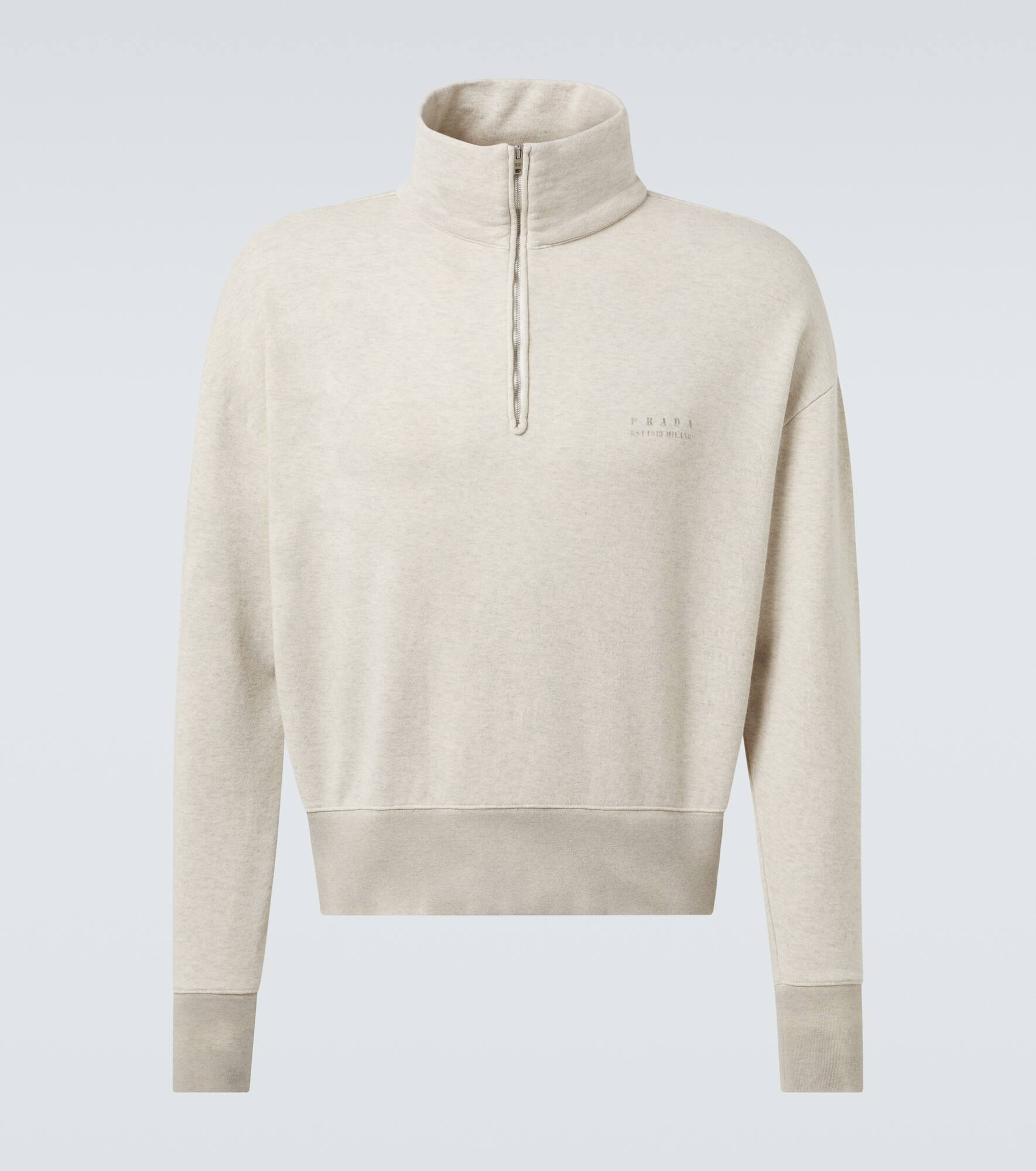Prada's exceptional design makes even a casual sweatshirt a noteworthy addition to your wardrobe. Made from especially soft cotton, this sweatshirt has a half-zip collar and the brand's logo at the heart. Product Details - Material: 100% cotton - Care instructions: dry clean - Made in Italy - Designer color name: Naturale - Item color: ivory - Cuff: ribbed - Hem: ribbed - Closure: zipped front - Item number: P01060641 Size & Fit - True to size - For a looser fit, we recommend taking one size up - Straight fit - Slightly stretchy fabric - Slightly cropped - The model in the picture is 185cm-6'1" and wearing a size L