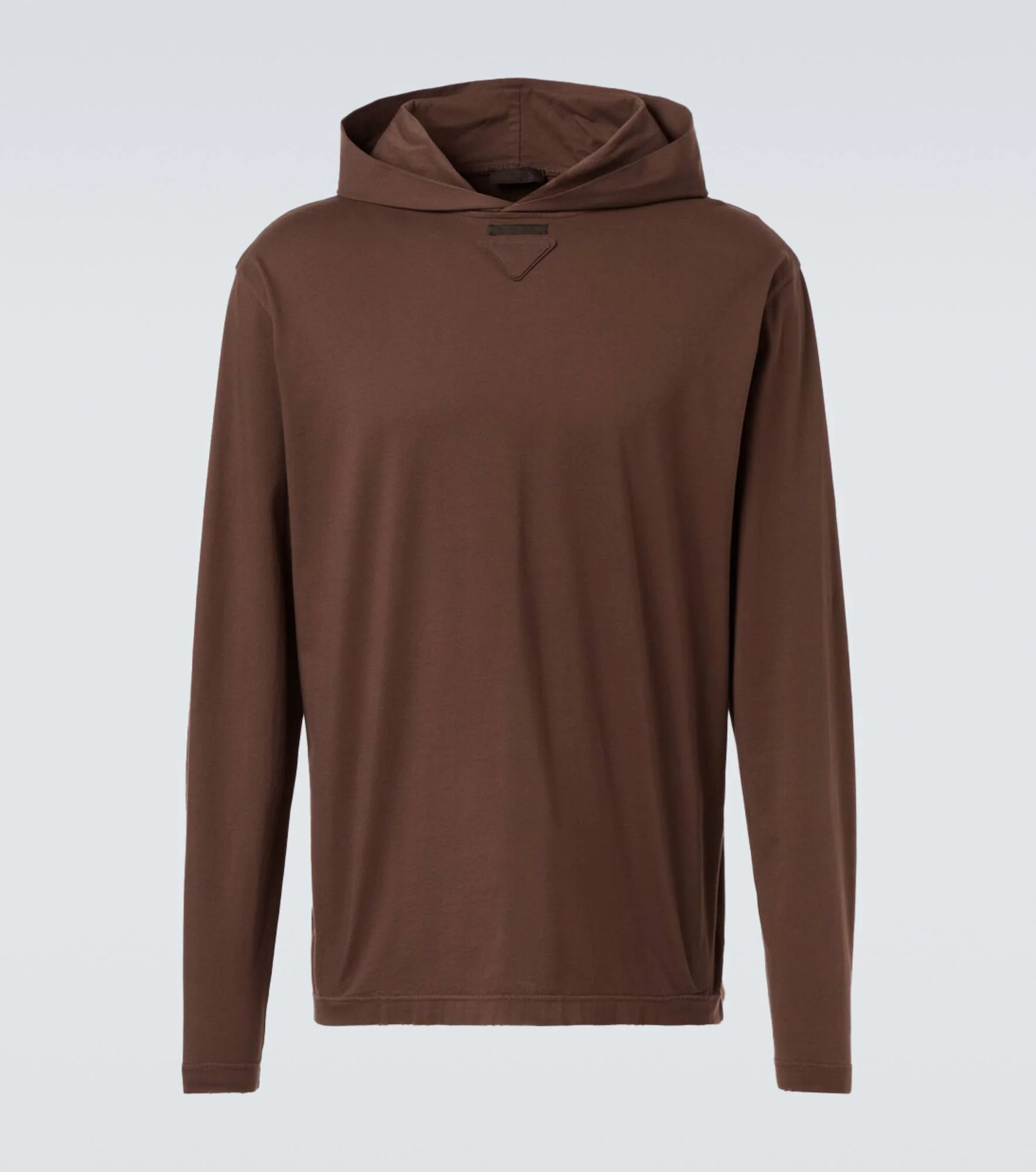 This Prada cotton hoodie is an effortless essential with its relaxed silhouette and versatile design. The piece is finished with the house's signature triangle logo at the neckline. Product Details - Material: 100% cotton - Care instructions: hand wash - Made in Romania - Designer color name: Brown - Item color: brown - Hood - Item number: P01093740 Size & Fit - True to size - Dropped shoulders - Designed for a loose fit - Slightly stretchy fabric - Falls below the hip - The model in the picture is 185cm-6'1" and wearing a size L