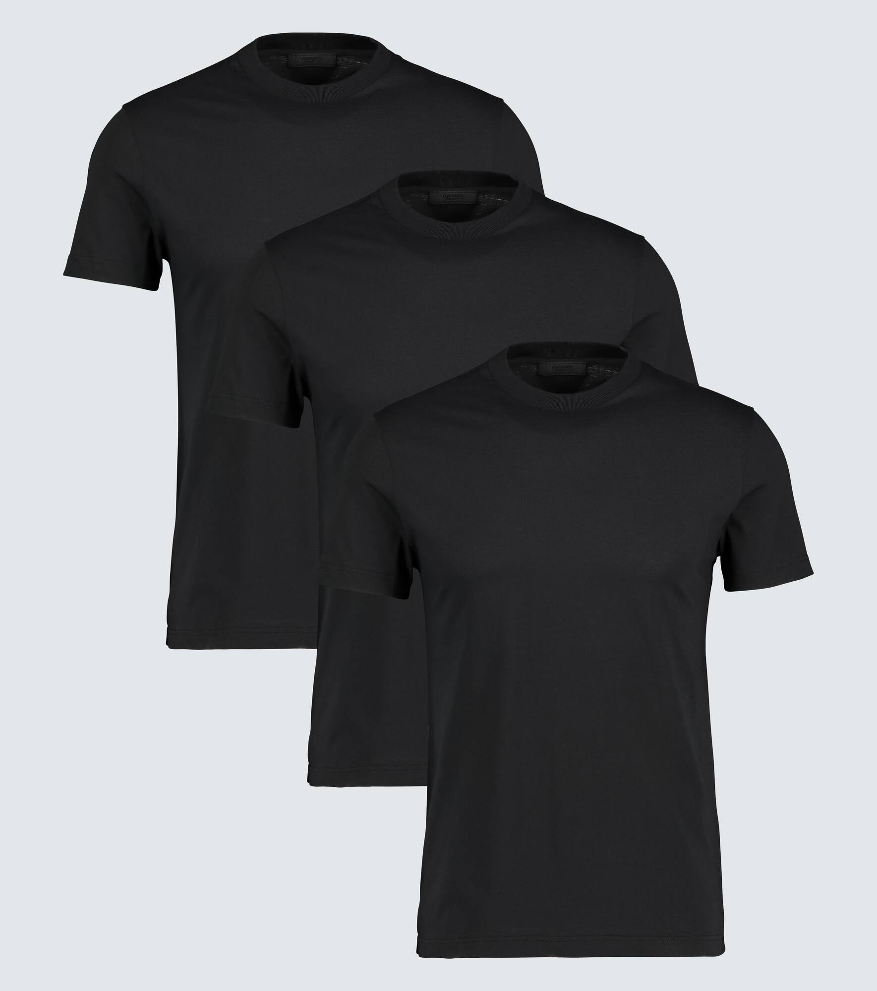 Prada's pack of three cotton jersey T-shirts in black offer a slim-fit. Product Details - Care instructions: machine wash at 30 degrees - Material: 100% cotton - Made in Romania - Designer color name: Black - Item number: P00441332 Size & Fit - Fits small to size - we recommend trying one size larger - Regular fit - Falls to the hip - The model in the picture is 185cm-6'1" and wearing a size L