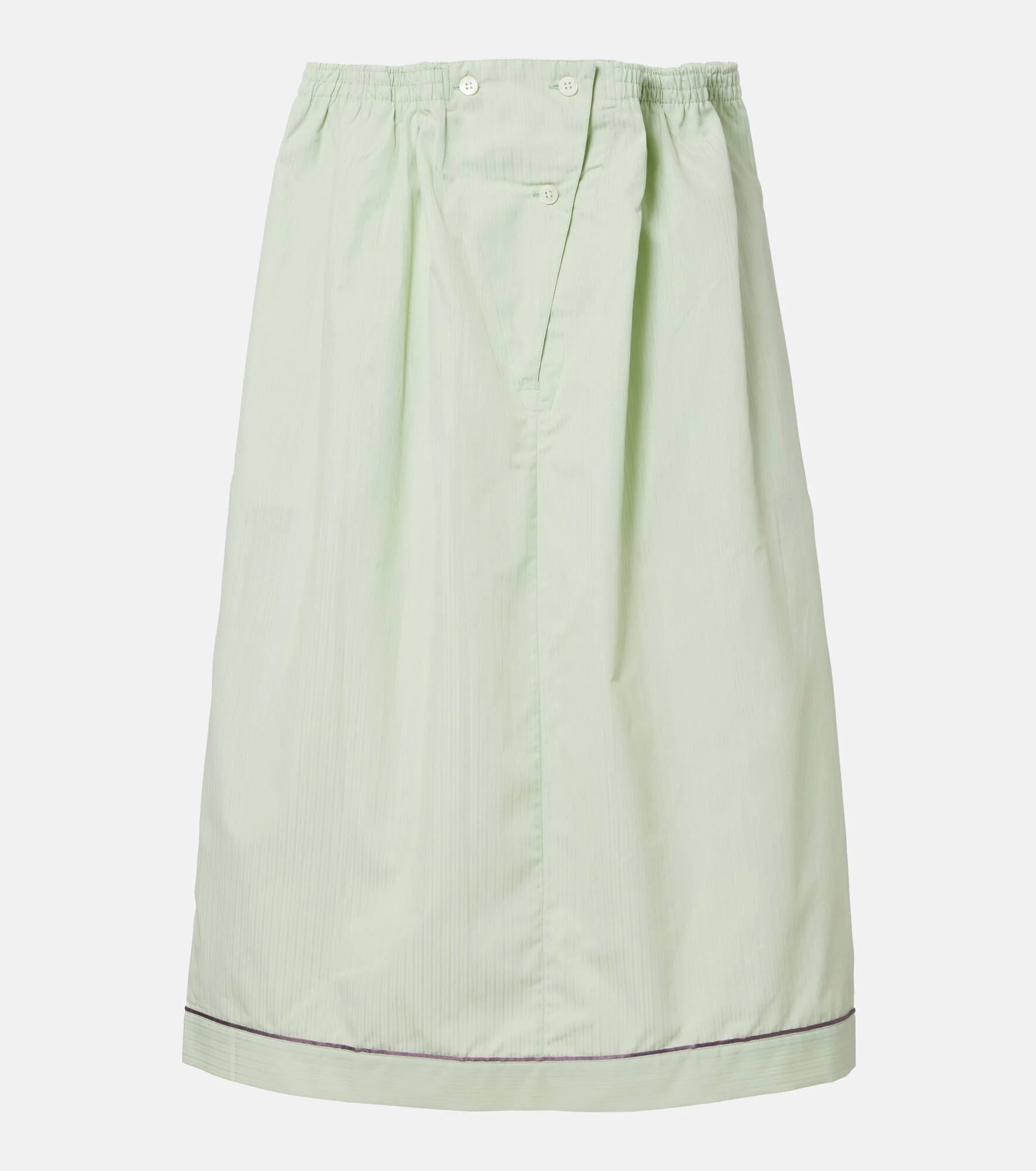 Prada takes Italian heritage into a distinctly modern direction with a streamlined and fashion-forward approach. Made from cotton, this skirt falls to an elegant midi length and is detailed with subtle tonal stripes throughout. Product Details - Material: 100% cotton - Care instructions: dry clean - Made in Italy - Designer color name: Acqua - Item color: green - Contains non-textile parts of animal origin - Closure: buttoned front - Elasticated waistband - Item number: P01110567 Size & Fit - True to size - Elasticated waist - Non-stretchy fabric - High-waisted - The model seen in the picture is 178cm-5'10" and wearing a size IT 40