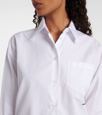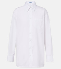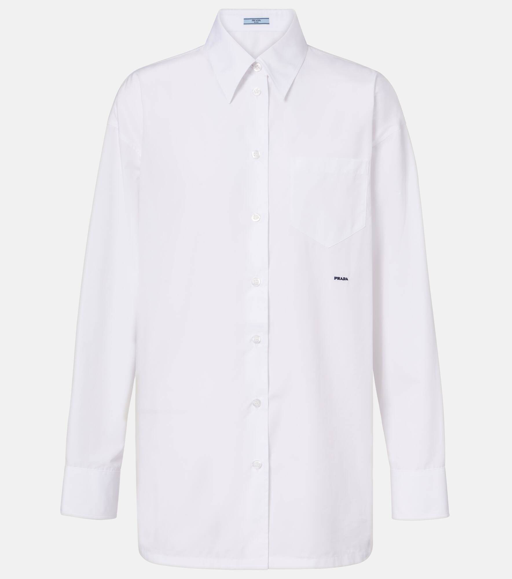 Prada takes Italian heritage into a distinctly modern direction with a streamlined and fashion-forward approach. This cotton poplin shirt has a loose fit and subtle logo embroidery on the side. Product Details - Material: 100% cotton - Care instructions: dry clean - Made in Italy - Designer color name: Bianco - Item color: white - Closure: buttoned front - Pockets: patch - Cuff: buttoned - Item number: P01061903 Size & Fit - True to size - Dropped shoulders - Designed for a loose fit - Non-stretchy fabric - Falls below the hip - The model seen in the picture is 178cm-5'10" and wearing a size IT 40