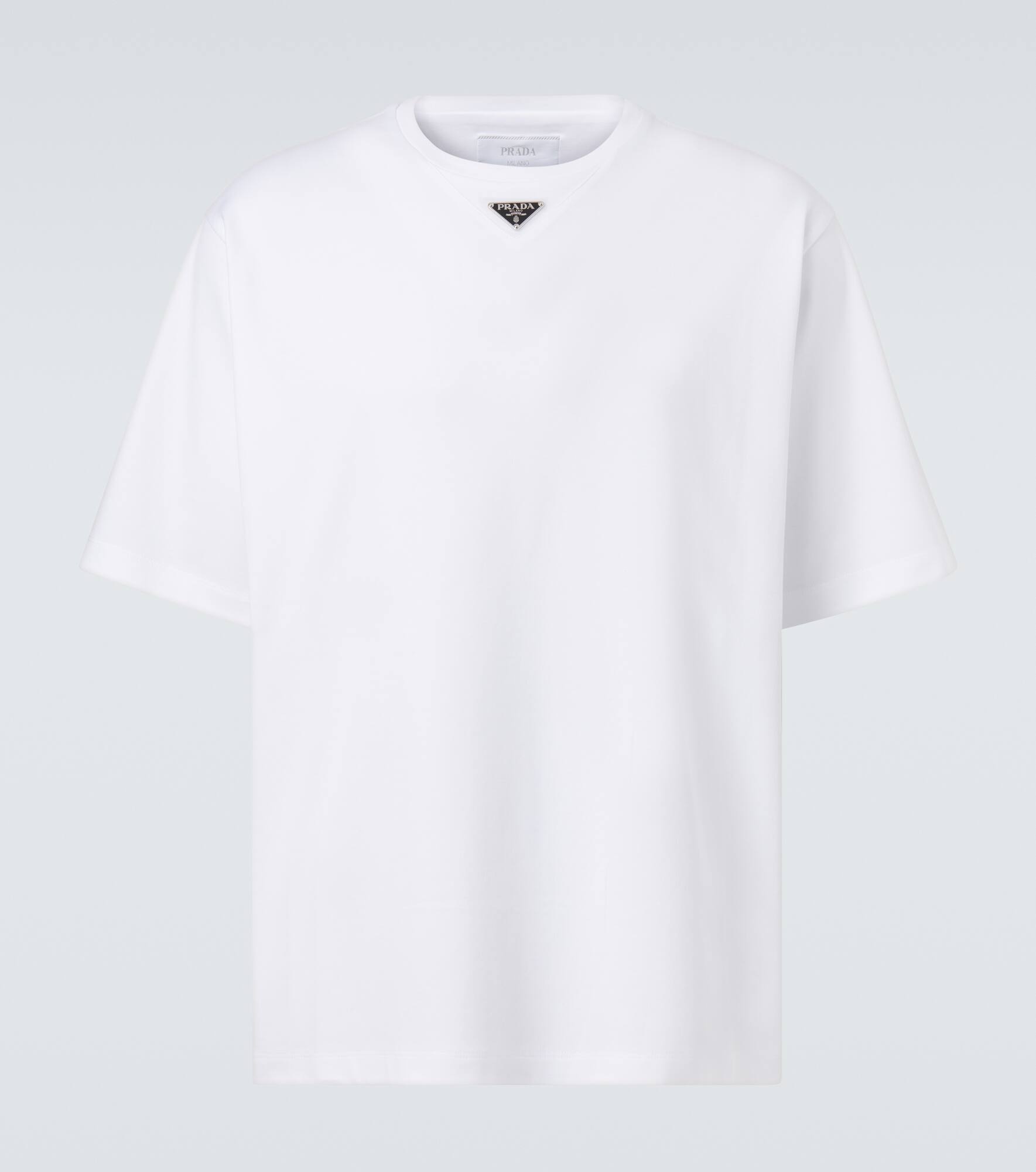 Made from soft cotton, this T-shirt features a minimalist cut and subtle logo detailing. Prada takes Italian heritage into a distinctly modern direction with a streamlined and fashion-forward approach. Product Details - Material: 100% cotton - Care instructions: hand wash - Made in Italy - Designer color name: White - Item color: white - Sleeves: short-sleeved - Collar: crewneck - Item number: P01068871 Size & Fit - True to size - Dropped shoulders - Designed for a loose fit - Slightly stretchy fabric - Falls to the hip - The model in the picture is 185cm-6'1" and wearing a size L