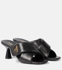 Prada's triangle logo pays tribute to the brand's long-standing connection to the Italian royal family, the House of Savoy. It glints from the side of the Criss Cross mules, a leather pair that features crossing straps and 65mm heels. Product Details - Upper: leather - Lining: leather - Sole: leather insole and sole - Toe shape: square open toe - Made in Italy - Includes: shoe box, dust bag, extra heel tips - Designer color name: Black - Item color: black - Item number: P01010537 Size & Fit - True to size - European sizes - 6,5cm-2.5" heel (size EU 38)