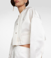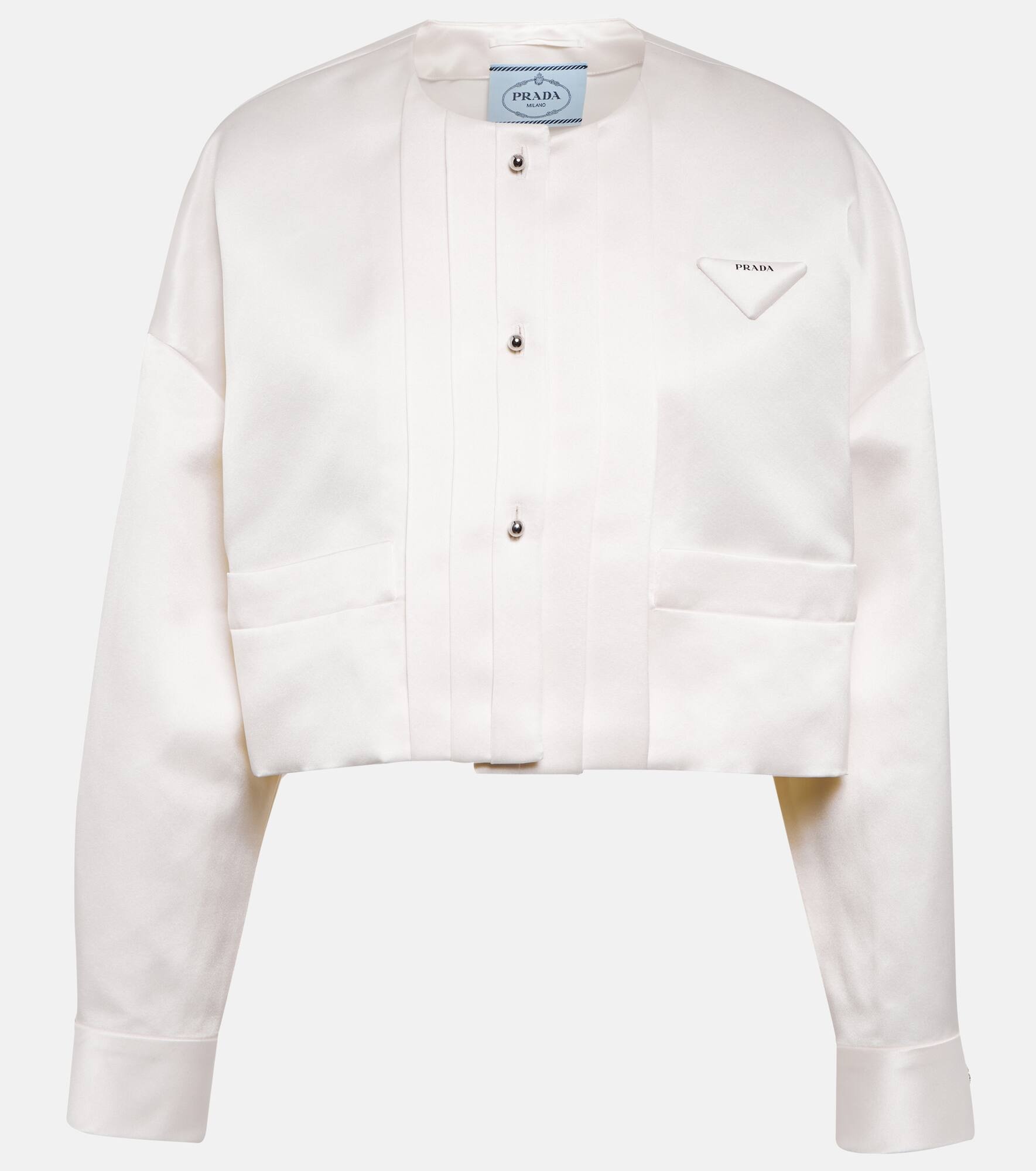 Adopt a retro-classic lifestyle in this cropped silk jacket from Prada. This piece features Prada's iconic triangular logo plaque, which embodies simplicity, elegance, and quality, a perfect summary of this style as a whole. Product Details - Lining: 66% viscose, 34% silk, partially lined - Made in Italy - Buttoned cuffs - Designer color name: Bianco - Pockets: slit pockets - Material: 100% silk - Closure: buttoned front - Care instructions: dry clean - Item number: P00759991 Size & Fit - Fits large to size - we recommend trying one size smaller - Dropped shoulders - Oversized - Cropped - The model seen in the picture is 178cm-5'10" and wearing a size IT 38