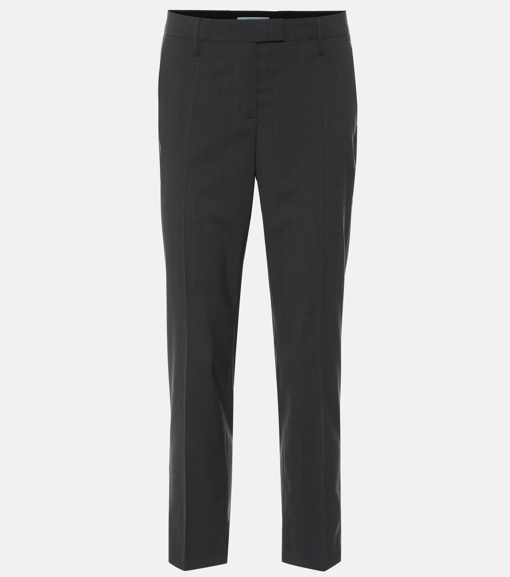 A wardrobe staple that can be styled in a myriad of ways, these gray cropped pants from Prada are rendered with the label's signature contemporary sophistication. Tailored in Italy, this mid-rise style falls into straight legs that crop artfully at the ankle. Silver-hued zips appear at the back of hemline, for a subtle hint of subversion. Product Details - Material II: 100% cotton - Made in Italy - Designer color name: Grey - Material: 100% virgin wool - Closure: concealed zipper, hook-fastening front, concealed buttoned front, zipped front - Pocket lining: 100% cupro - Belt loops - Pockets: side slit pockets, back pockets - Item number: P00364771 Size & Fit - True to size - Straight leg - The model seen in the picture is 178cm-5'10" and wearing a size IT 40