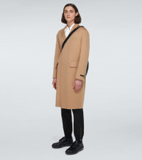 Italian-crafted from 100% cashmere, this camel double-breasted overcoat from Prada has a minimalist design with a concealed buttoned front, a notched lapel, and tonal triangle logo patch at the nape. Product Details - Material: 100% cashmere - Made in Italy - Pockets: flap pockets, breast pocket - Designer color name: Cammello - Lining: 100% cupro, partially lined - Closure: buttoned front - Care instructions: dry clean - Item number: P00521898 Size & Fit - True to size - Designed for a loose fit - The model in the picture is 185cm-6'1" and wearing a size IT 48