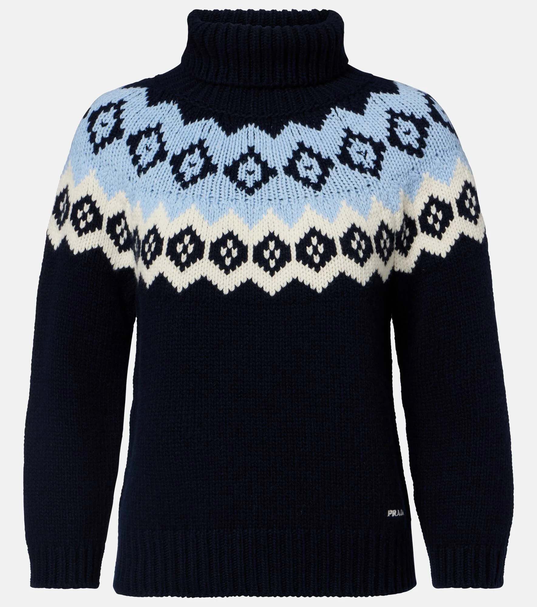 Prada embodies modern sophistication, blending timeless Italian craftsmanship with an innovative spirit. This turtleneck sweater is made from a blend of wool and cashmere and features a Fair Isle intarsia motif. Product Details - Material: 70% wool, 30% cashmere - Care instructions: dry clean - Made in Italy - Designer color name: Blue - Item color: blue - Collar: turtleneck - Cuff: ribbed - Hem: ribbed - Item number: P01132951 Size & Fit - True to size - Slightly short sleeves - Designed for a loose fit - Falls to the hip - The model seen in the picture is 178cm-5'10" and wearing a size IT 40