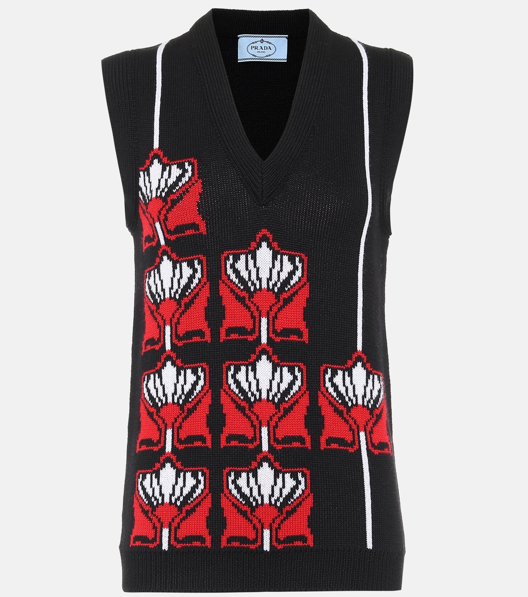 For Fall '20, Prada blends traditionally feminine tropes with masculine styles, as displayed by this wool sweater vest. The black V-neck style, normally seen in men's suiting, arrives slightly oversized and is adorned with a retro-style floral print. Wear it with the collection's fringed skirts to complete the look. Product Details - Made in Italy - Material: 100% virgin wool - Care instructions: dry clean - Designer color name: Black+Red - Item number: P00513032 Size & Fit - True to size - Designed for a loose fit - Thick material - Falls to the hip - The model seen in the picture is 178cm-5'10" and wearing a size IT 40