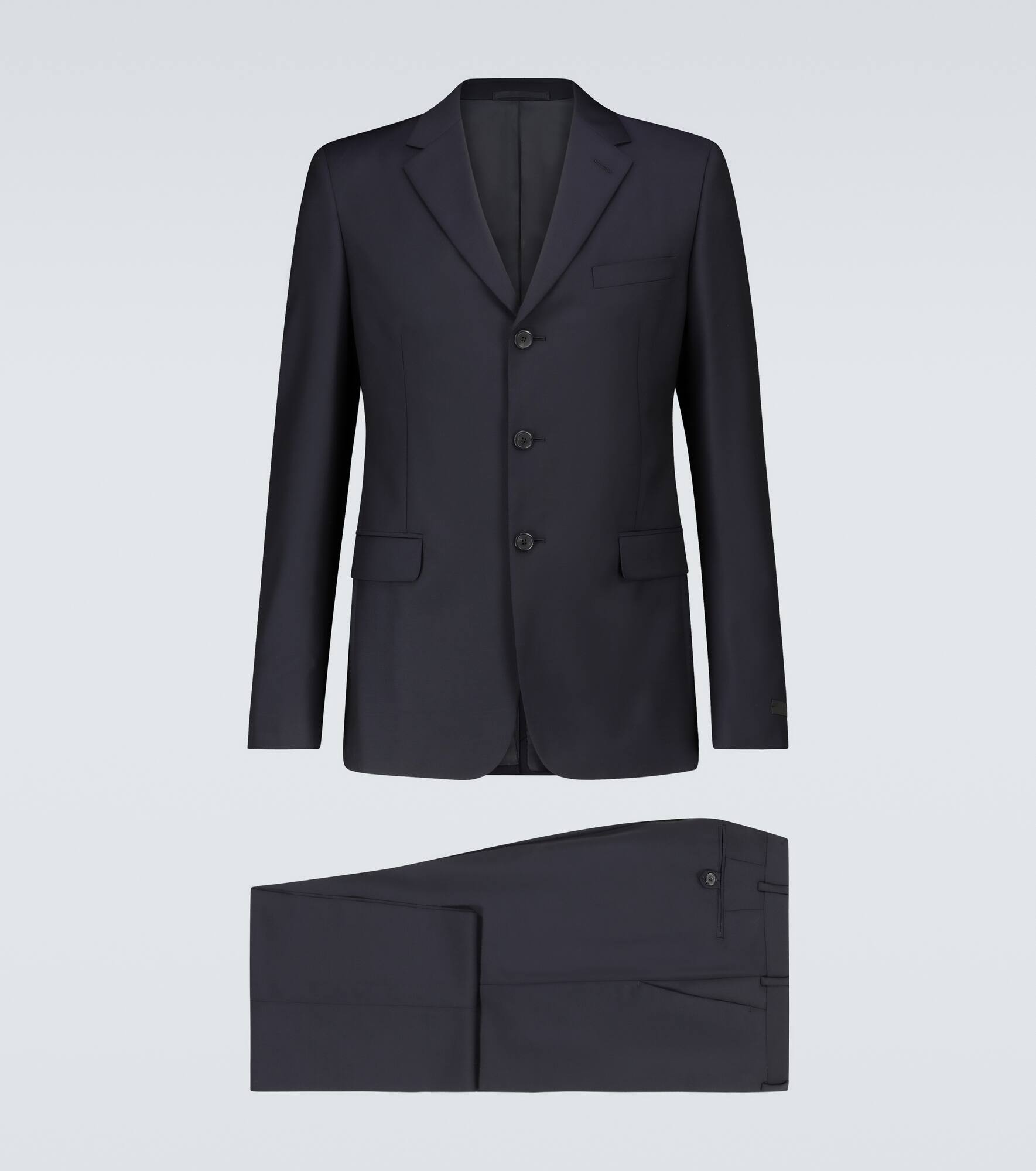 Italian-tailored from wool and mohair blend, this navy Prada suit comes with a single-breasted three-button blazer and matching unhemmed, formal pants. Product Details - Made in Italy - Material II: 84% wool, 16% mohair - Pockets: breast pocket, flap pockets - Designer color name: Blue - Material: 84% wool, 16% mohair - Lining II: 100% viscose, partially lined - Lining: 100% viscose, fully lined - Closure: zipper fly, button fastening, buttoned front - Care instructions: dry clean - Belt loops - Pocket lining: 100% cotton - Shoulder pads - Item number: P00521857 Size & Fit - True to size - Shoulder pad inserts - Slim fit - Falls to the hip - Slim-leg - The model in the picture is 185cm-6'1" and wearing a size IT 48