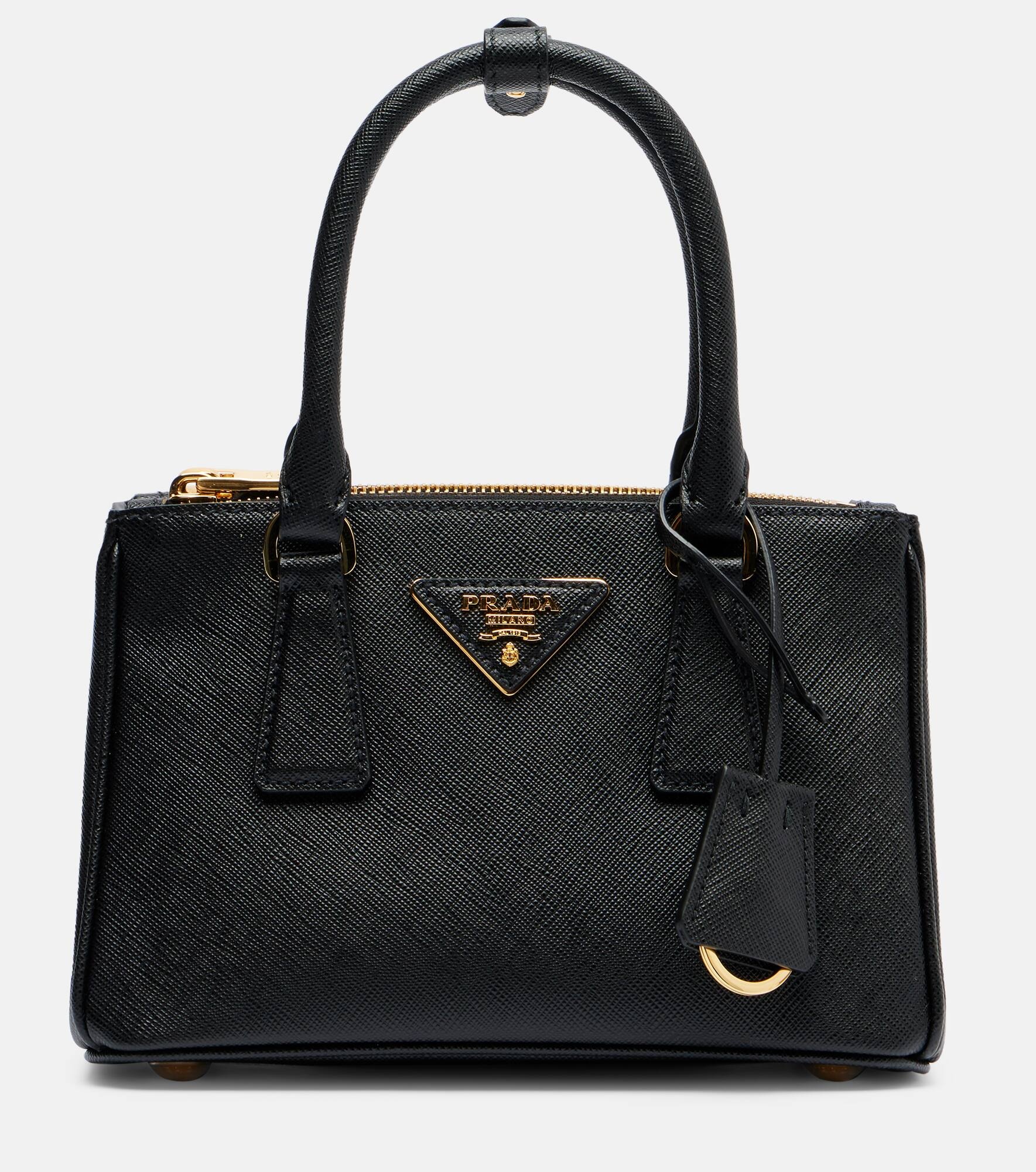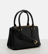 Made from signature Saffiano leather, the Galleria Mini tote features structured lines, double top handles, and logo hardware. Prada takes Italian heritage into a distinctly modern direction with a streamlined and fashion-forward approach. Product Details - Material: calf leather - Lining: nylon, calf leather - Made in Italy - Designer color name: Black - Item color: black - Hardware color: gold - Detachable, adjustable shoulder strap, Top handles - Internal details: internal zipped pocket, internal slot pocket, three internal compartments - Closure: snap-buttoned fastening, open top, zipped top - Detachable charm - Includes: dust bag - Item number: P01075900 Size & Fit - Height 14cm-5.5" - Width 21cm-8.5" - Depth 10cm-4" - Length of handles 32cm-12.5" - Adjustable shoulder strap - Max. length shoulder strap 126cm-49.5"