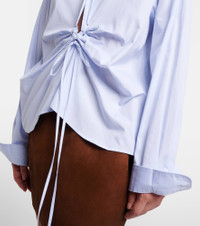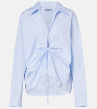 Prada embodies modern sophistication, blending timeless Italian craftsmanship with an innovative spirit. A modern take on a wardrobe staple, this shirt is made from lightweight cotton and is defined by gathered detailing in the front. Product Details - Material: 100% cotton - Care instructions: hand wash cold - Made in Italy - Designer color name: Light Blue - Item color: blue - Boning - Cuff: buttoned - Closure: button fastening, self-ties - Hem: uneven - Item number: P01124850 Size & Fit - True to size - Dropped shoulders - Designed for a loose fit - Non-stretchy fabric - Falls to the hip - The model seen in the picture is 178cm-5'10" and wearing a size IT 40