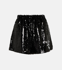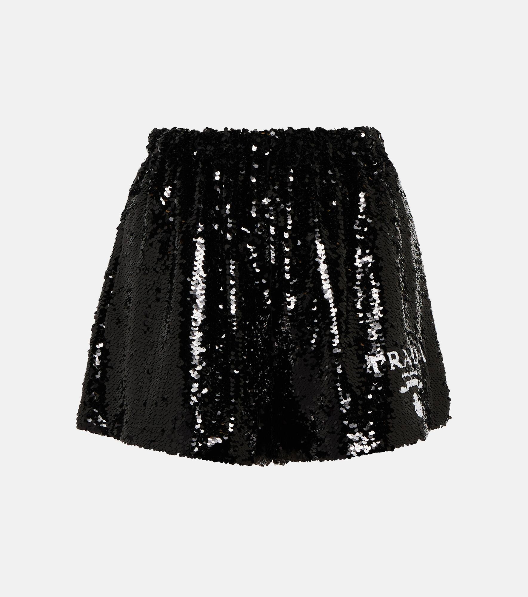 Although a quintessential sportswear silhouette, these Prada shorts are glamorous through and through. The high-rise style is embellished with sparkling sequins and a contrast-colored logo accent. Style yours with the label’s matching hoodie. Product Details - Lining: 66% viscose, 34% silk, fully lined - Made in Italy - Pockets: side slit pockets - Designer color name: Nero - Elasticated waistband - Material: 100% silk - Care instructions: dry clean - Item number: P00623552 Size & Fit - True to size - Elasticated waist - Wide-leg - High-waisted - The model seen in the picture is 178cm-5'10" and wearing a size IT 40