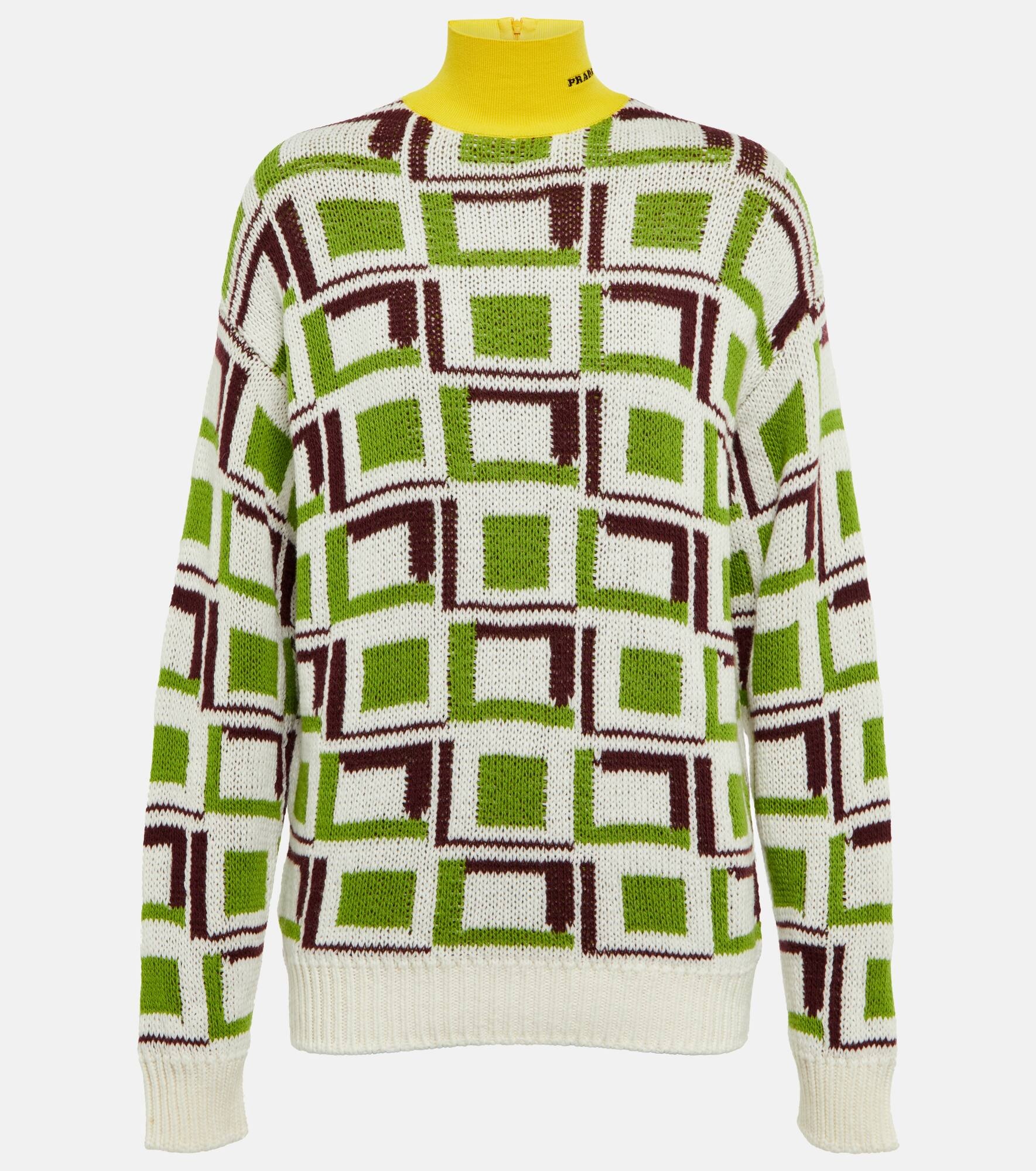 Woven from a rich blend of wool, cashmere, and cotton, this turtleneck sweater from Prada is made to turn heads. The relaxed-fit style boasts a geometric intarsia motif inspired by the brand's 1996 prints. Product Details - Material: 68% wool, 29% cashmere, 3% cotton - Made in Italy - Closure: zipped back - Designer color name: Edera - Care instructions: hand wash - Item number: P00726424 Size & Fit - Fits large to size - we recommend trying one size smaller - Dropped shoulders - Designed for a loose fit - Falls to the hip - The model seen in the picture is 178cm-5'10" and wearing a size IT 38