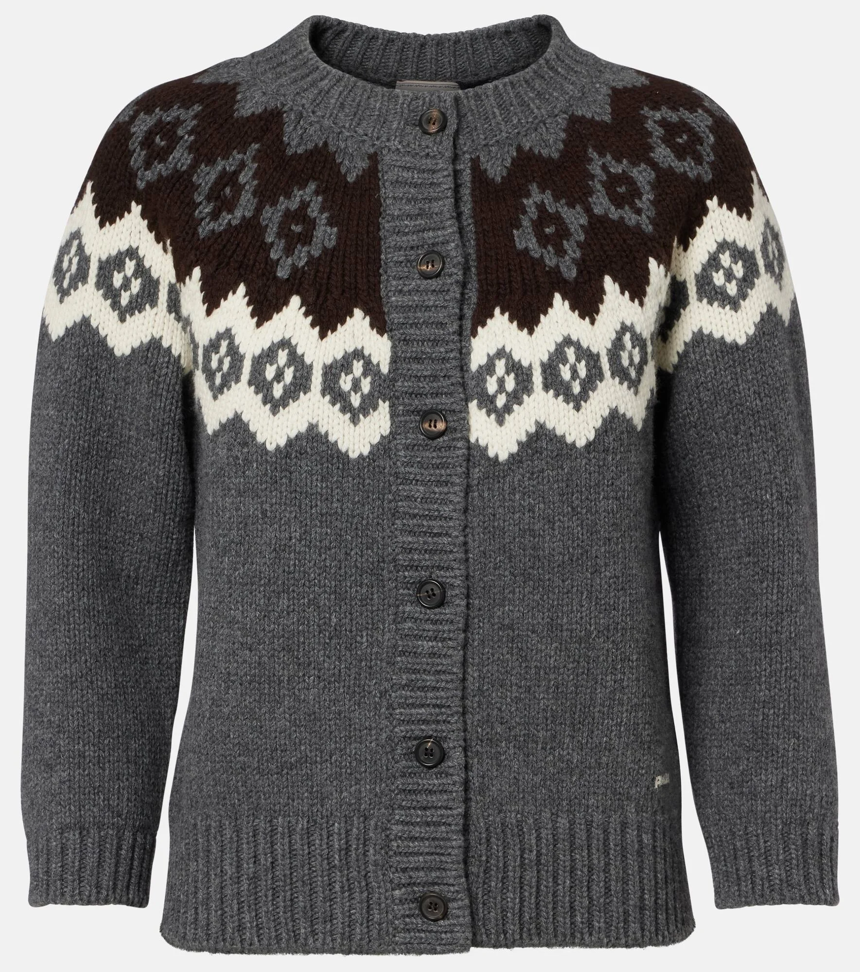 This Prada cardigan elevates your favorite apres-ski looks with its vintage intarsia pattern. The piece is crafted in Italy from wool and cashmere and features three-quarter sleeves and a classic buttoned front. Product Details - Material: 70% wool, 30% cashmere - Care instructions: dry clean - Made in Italy - Designer color name: Ardesia+Naturale - Item color: gray, brown - Closure: buttoned front - Cuff: ribbed - Hem: ribbed - Contains non-textile parts of animal origin - Item number: P01140470 Size & Fit - True to size - Slightly short sleeves - Straight fit - Falls to the hip - The model seen in the picture is 178cm-5'10" and wearing a size IT 40