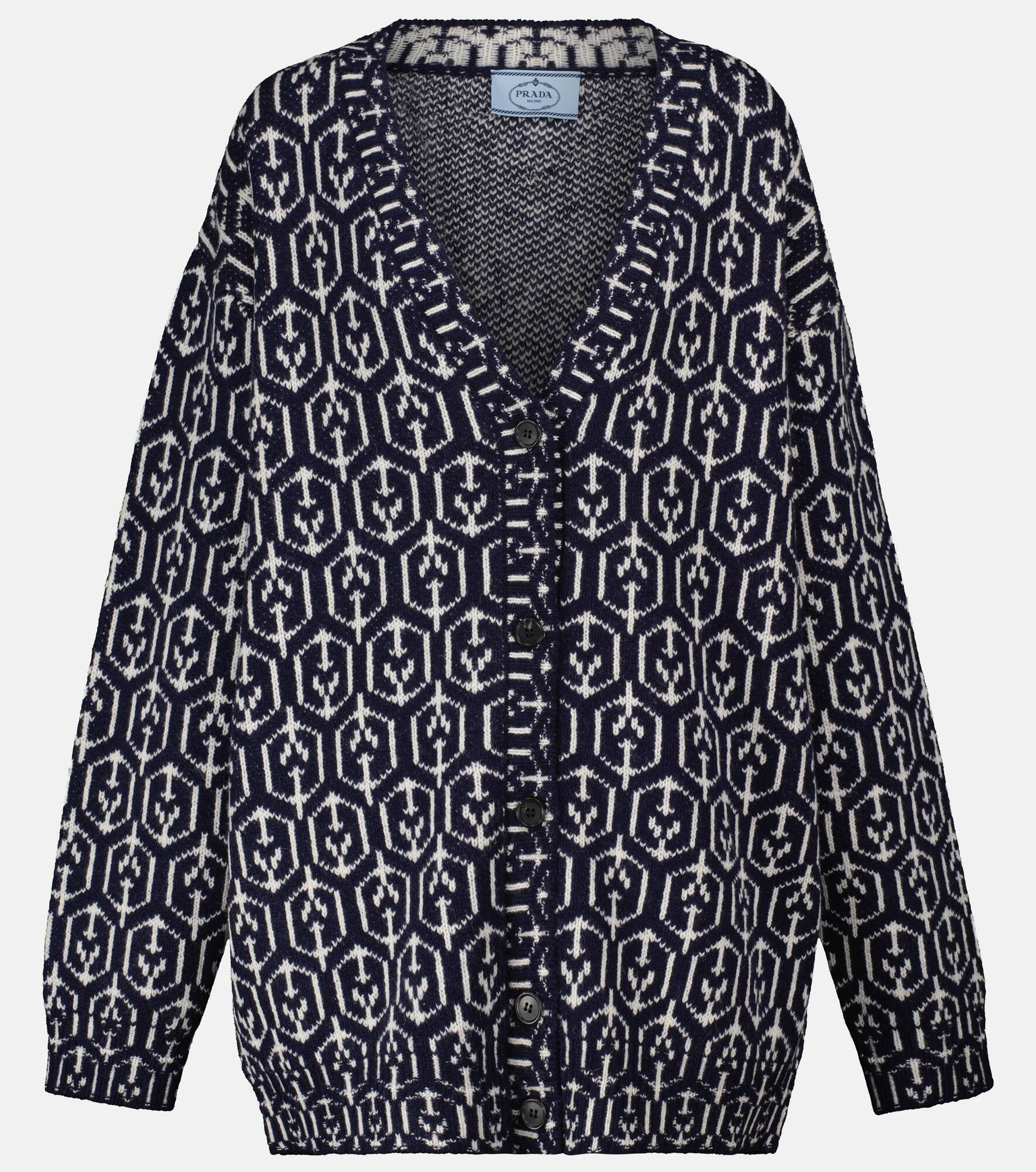 Opt for striking knitwear with this geometric jacquard-knit cardigan from Prada. It's made from soft-handled wool, and finished with a subtle tortoiseshell button-down front. Product Details - Made in Italy - Material: 100% virgin wool - Closure: buttoned front - Designer color name: Blu+Bianco - Care instructions: dry clean - Item number: P00594902 Size & Fit - True to size - Dropped shoulders - Oversized - Falls below the hip - The model seen in the picture is 178cm-5'10" and wearing a size IT 40