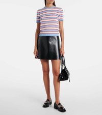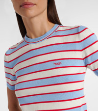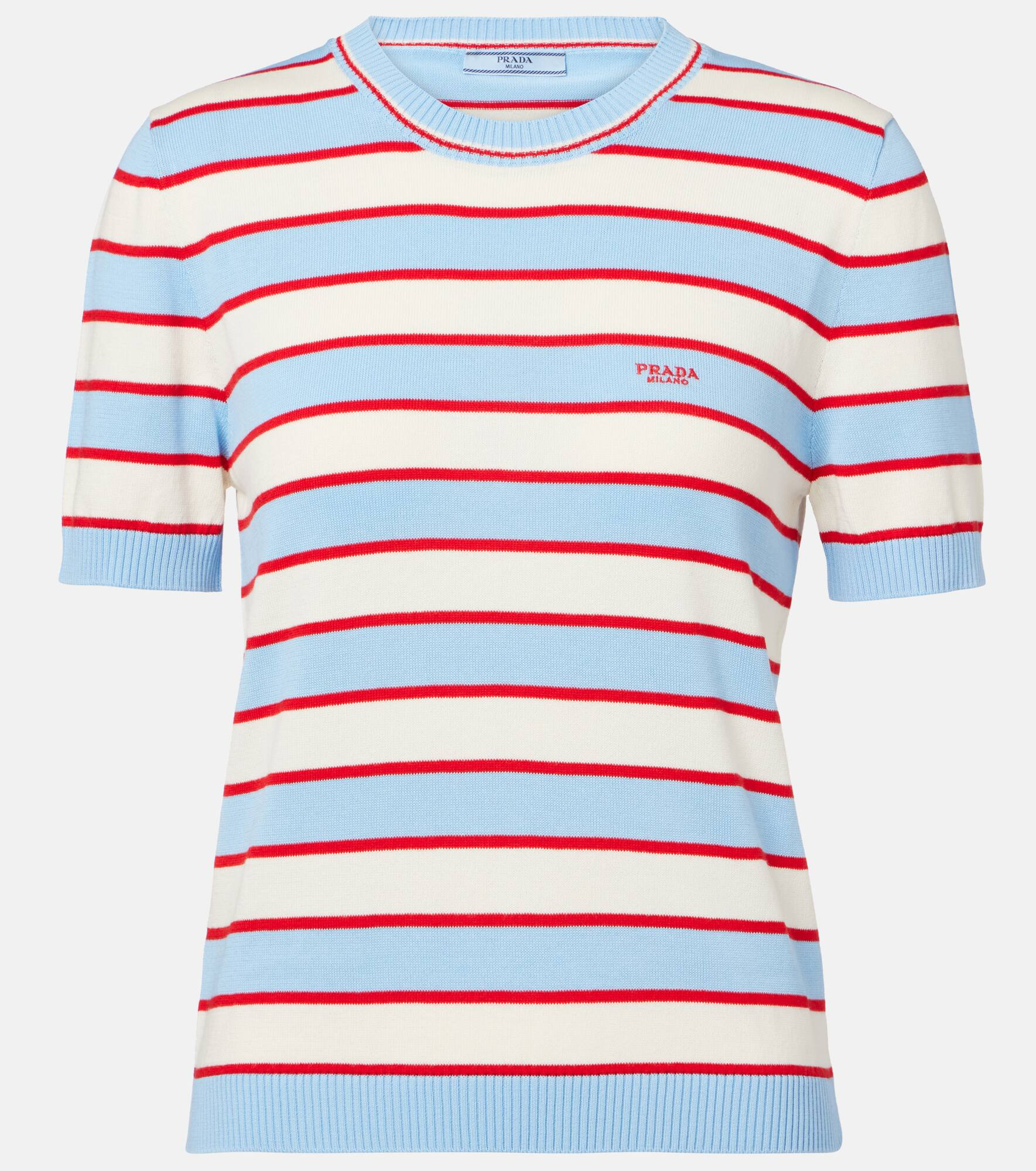 Prada takes Italian heritage into a distinctly modern direction with a streamlined and fashion-forward approach. Complete with red, white, and blue stripes, this top is a short-sleeved style knitted purely from cotton. Product Details - Material: 100% cotton - Care instructions: dry clean - Made in Italy - Designer color name: Light Blue - Item color: blue, white - Collar: crewneck - Item number: P01064981 Size & Fit - True to size - Straight fit - Slightly stretchy fabric - Falls to the hip - The model seen in the picture is 178cm-5'10" and wearing a size IT 40