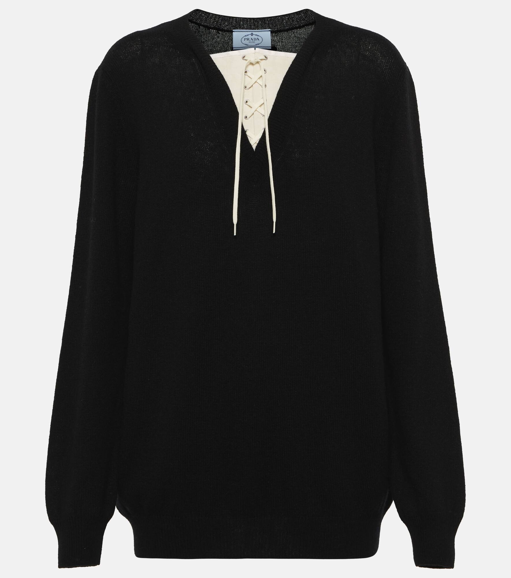 This sweater from Prada has a deep V-neckline with a cotton coutil lace-up insert that's inspired by corsetry. It's knitted from soft cashmere to a relaxed shape. Product Details - Material II: 100% cotton - Material: 100% cashmere - Designer color name: Nero - Made in Italy - Material III: 100% silk - Self-tie collar - Item number: P00654586 Size & Fit - True to size - Dropped shoulders - Designed for a loose fit - Falls below the hip - The model seen in the picture is 178cm-5'10" and wearing a size IT 40