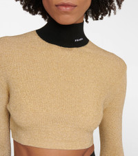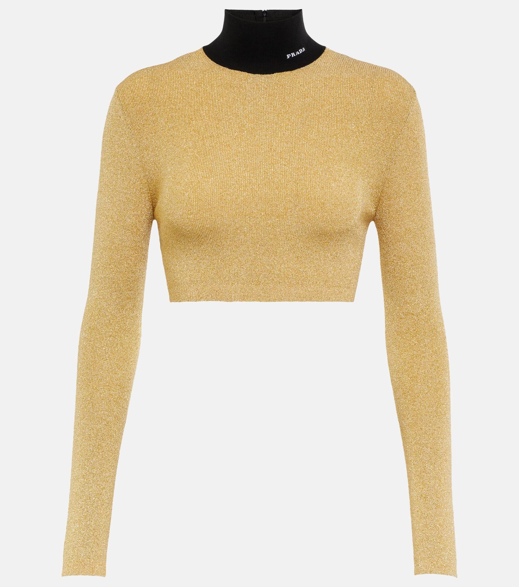 Enliven your edit with this contemporary hybrid sweater from Prada. Spun from shimmering lame yarn to a ribbed-knit design, the cropped silhouette features a contrasting turtleneck adding sports-luxe appeal. Product Details - Made in Italy - Material: 40% viscose, 23% metallic fibres, 22% polyamide, 13% cotton, 2% elastane - Closure: zipped back - Designer color name: Oro - Care instructions: dry clean - Item number: P00760000 Size & Fit - True to size - Fitted - Cropped - The model seen in the picture is 178cm-5'10" and wearing a size IT 40
