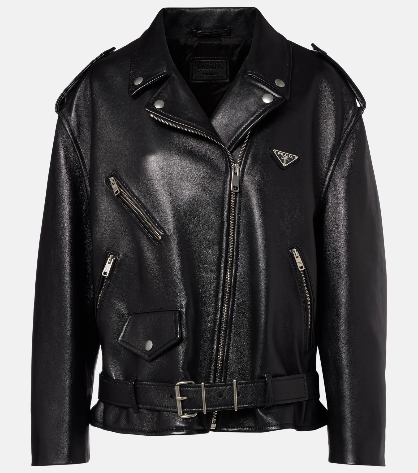 Prada embodies modern sophistication, blending timeless Italian craftsmanship with an innovative spirit. This leather biker jacket has a slightly oversized fit and is accented with the brand's triangle logo. Product Details - Material: 100% lamb leather - Care instructions: specialist clean - Made in Italy - Color: black - Designer color name: Black - Item color: black - Lining: 100% viscose - Epaulettes - Closure: zipped front - Cuff: zipped - Pockets: zipped pockets, snap-buttoned pocket, internal pocket - Attached belt - Hardware color: silver - Item number: P01140469 Size & Fit - True to size - For a closer fit, we recommend taking one size down - Dropped shoulders - Designed for a loose fit - Adjustable hem - Non-stretchy fabric - Falls below the hip - Height of model is 173cm-68" and wears a size IT 40