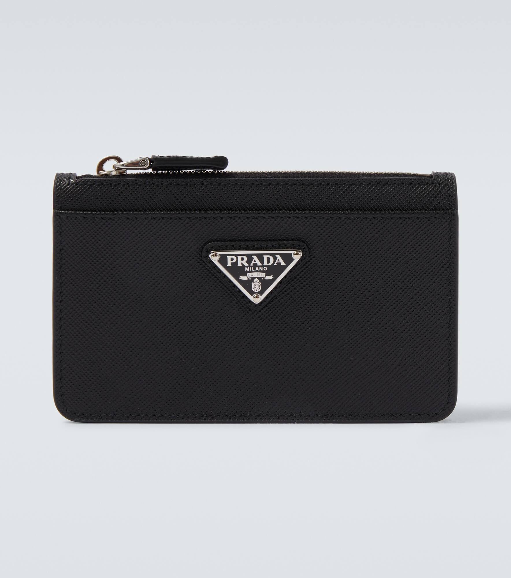 Prada's use of crosshatched Saffiano leather can be traced back to Mario Prada, who valued its sophistication and durability. This card holder is crafted from the iconic material and is topped with the brand's unmistakable logo. Product Details - Material: leather - Lining: leather, fabric - Made in Italy - Designer color name: Black - Item color: black - Internal details: zipped centre compartment, Card slots - Hardware color: silver - Item number: P01083940 Size & Fit - Height 8cm-3" - Width 13.5cm-5.5"