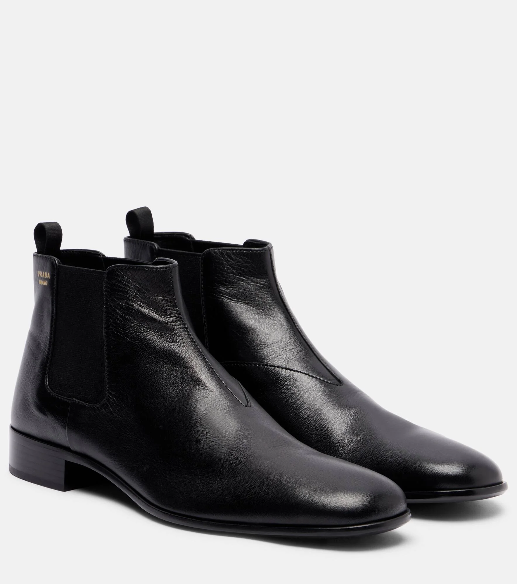 Prada takes Italian heritage into a distinctly modern direction with a streamlined and fashion-forward approach. Made in Italy from black leather, these Chelsea boots have tonal pull tabs, short block heels, and gold-toned logo signatures. Product Details - Upper: goat leather, fabric - Lining: leather - Sole: leather insole, leather and rubber sole - Toe shape: round toe - Made in Italy - Includes: shoe box, dust bag - Designer color name: Nero - Item color: black - Item number: P01119267 Size & Fit - True to size - European sizes - 2,5cm-1" heel (size EU 38)