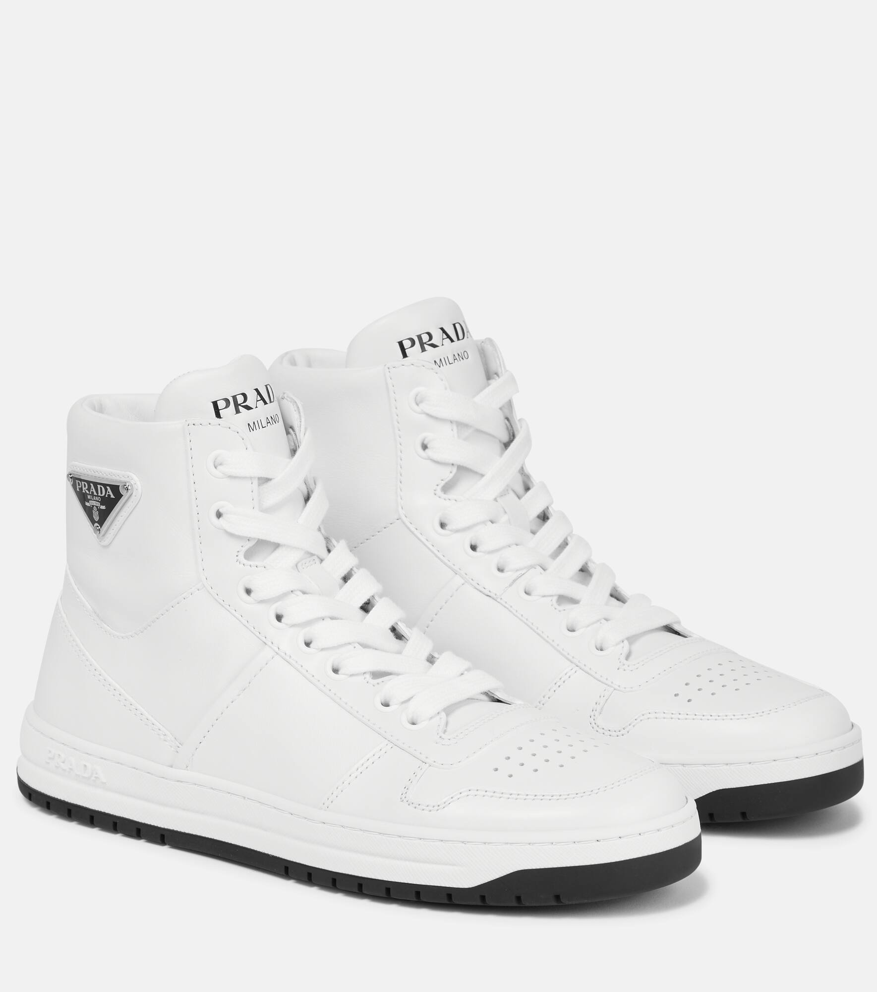 These high-top sneakers from Prada have a retro-sporty look. Reminiscent of vintage basketball silhouettes, they're crafted from leather with logo detailing at the tongues and sides. Product Details - Lining: leather, fabric - Sole: leather insole, rubber sole - Toe shape: round toe - Closure: lace-up - Comes with a box - Designer color name: Bianco+Nero - Made in Italy - Comes with dust bag - Upper: calf leather - Item number: P00618380 Size & Fit - True to size - European sizes - 2,5cm-1" platform (size EU 38) - 3cm-1" wedge heel (size EU 38)