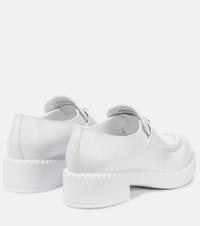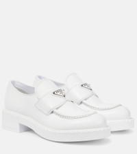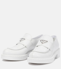 Trust Prada to present a pair of loafers that somehow speak to both the past and present at once. Made from polished white leather and set on platform soles, these topstitched loafers feature the triangle logo that has formed a part of fashion history forever. Product Details - Sole: leather insole, rubber sole - Toe shape: round toe - Upper: calf leather - Lining: fabric - Made in Italy - Designer color name: Bianco - Item number: P00540189 Size & Fit - True to size - Slightly narrow - European sizes - 4cm-1.5" heel (size EU 38) - 2,5cm-1" platform (size EU 38)