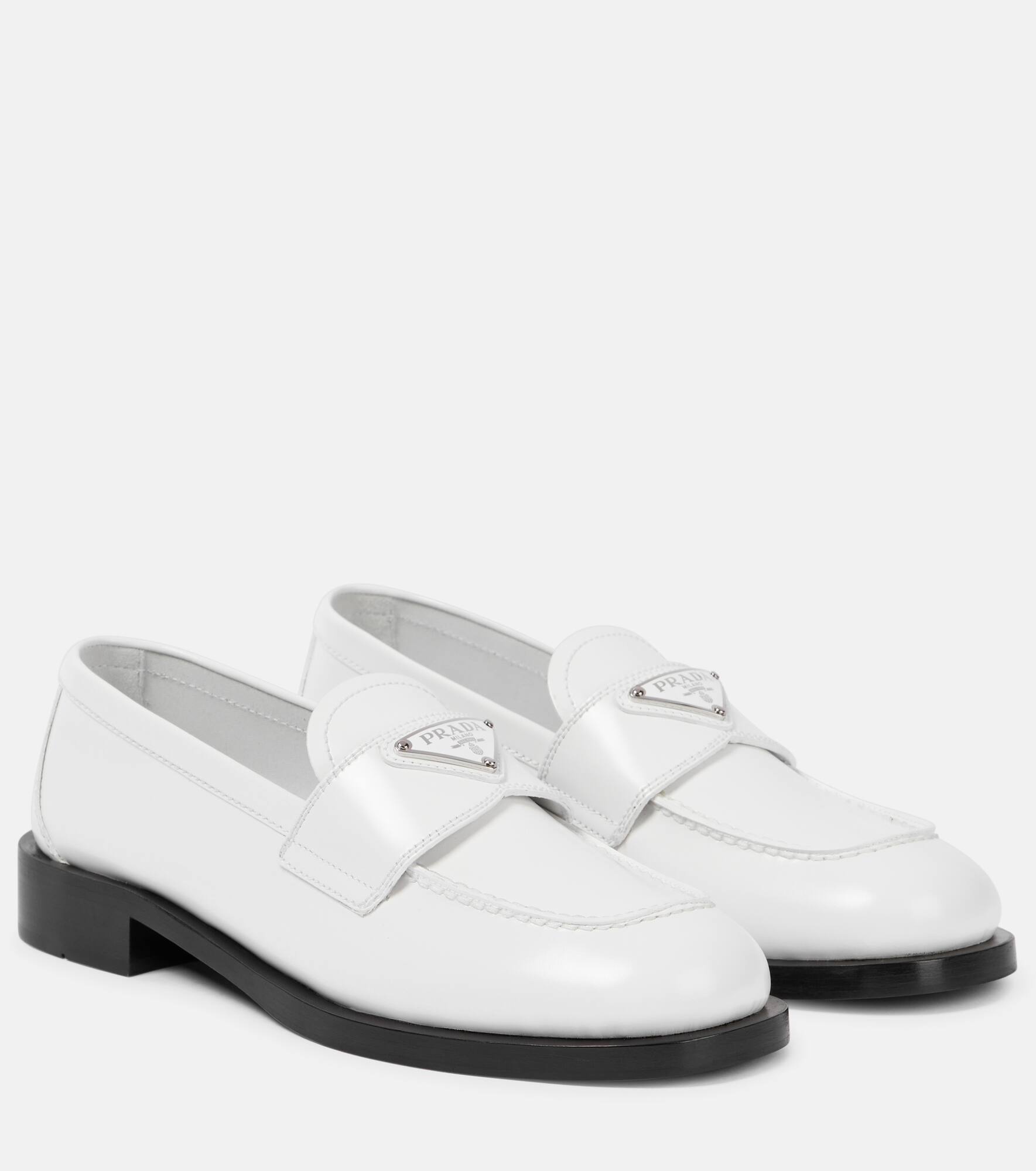 A pair of Prada loafers – adorned with triangular logo plaques – is the footwear must-have of the season. This style is made from brushed white calfskin leather with a high-shine finish. Product Details - Lining: leather - Sole: leather insole, rubber sole - Toe shape: round toe - Upper: calf leather - Comes with a box - Designer color name: Bianco - Made in Italy - Item number: P00637831 Size & Fit - True to size - Narrow at the back - European sizes - 2,5cm-1" heel (size EU 38)