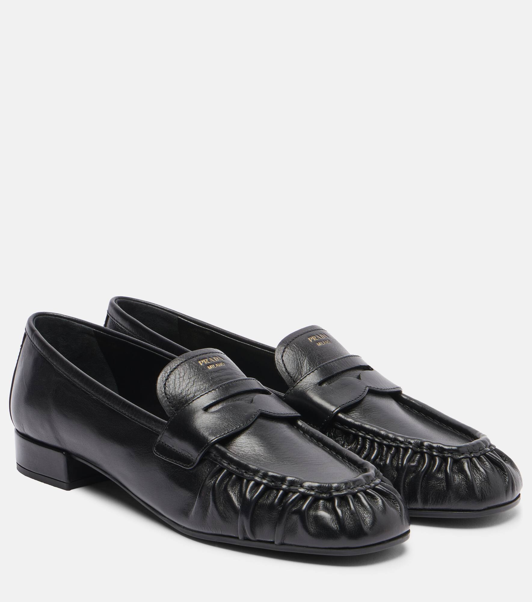 Prada embodies modern sophistication, blending timeless Italian craftsmanship with an innovative spirit. Case in point, these loafers are expertly made from leather into a classic silhouette with light gathering on the uppers. Product Details - Upper: buffalo leather - Lining: leather - Sole: leather insole, leather and rubber sole - Toe shape: round toe - Made in Italy - Includes: shoe box, dust bag - Designer color name: Nero - Item color: black - Item number: P01125536