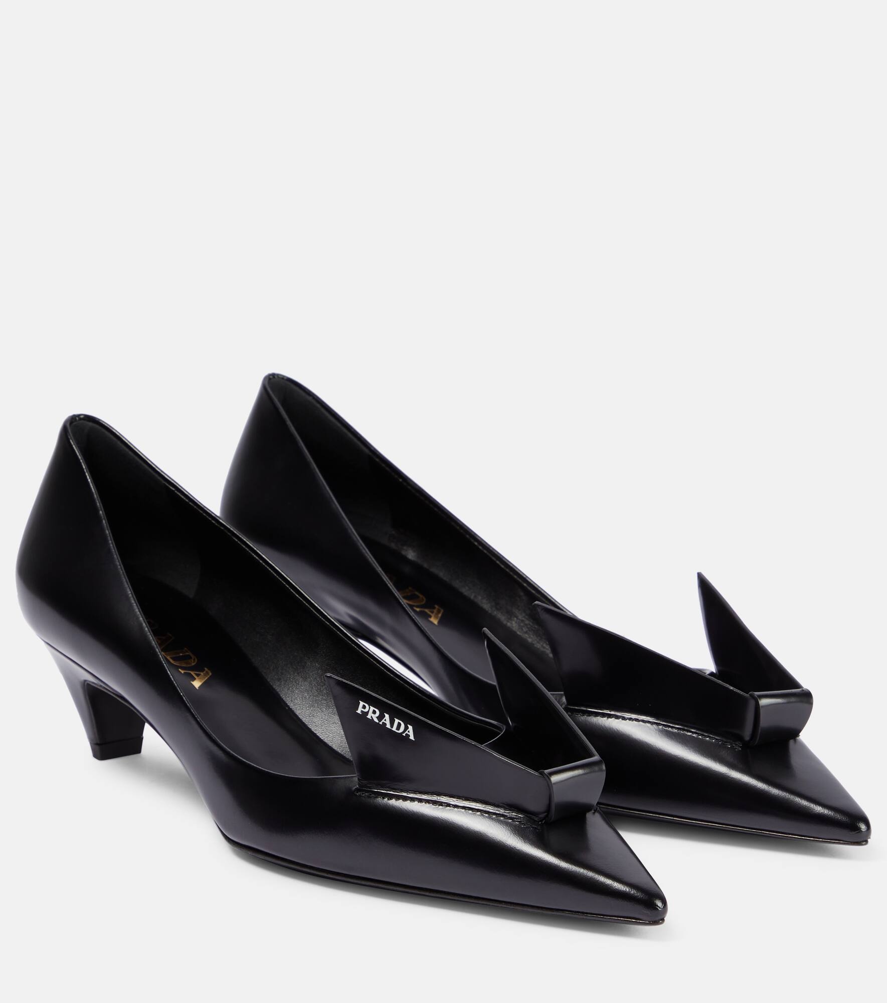 These pumps from Prada are defined by an architectural detail that lends the design a contemporary flair. The elegant pair is made from smooth leather, has a pointed-toe silhouette, and sits atop low heels. Product Details - Upper: calf leather - Lining: leather - Sole: leather insole and sole - Toe shape: pointed toe - Made in Italy - Designer color name: Nero - Comes with a box - Comes with dust bag - Item number: P00833439 Size & Fit - Fits slightly large to size - we recommend trying a half size smaller - Narrow at the toe - Stiff material - European sizes - 4,5cm-2" heel (size EU 38)