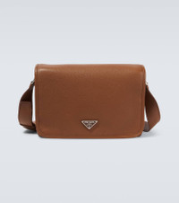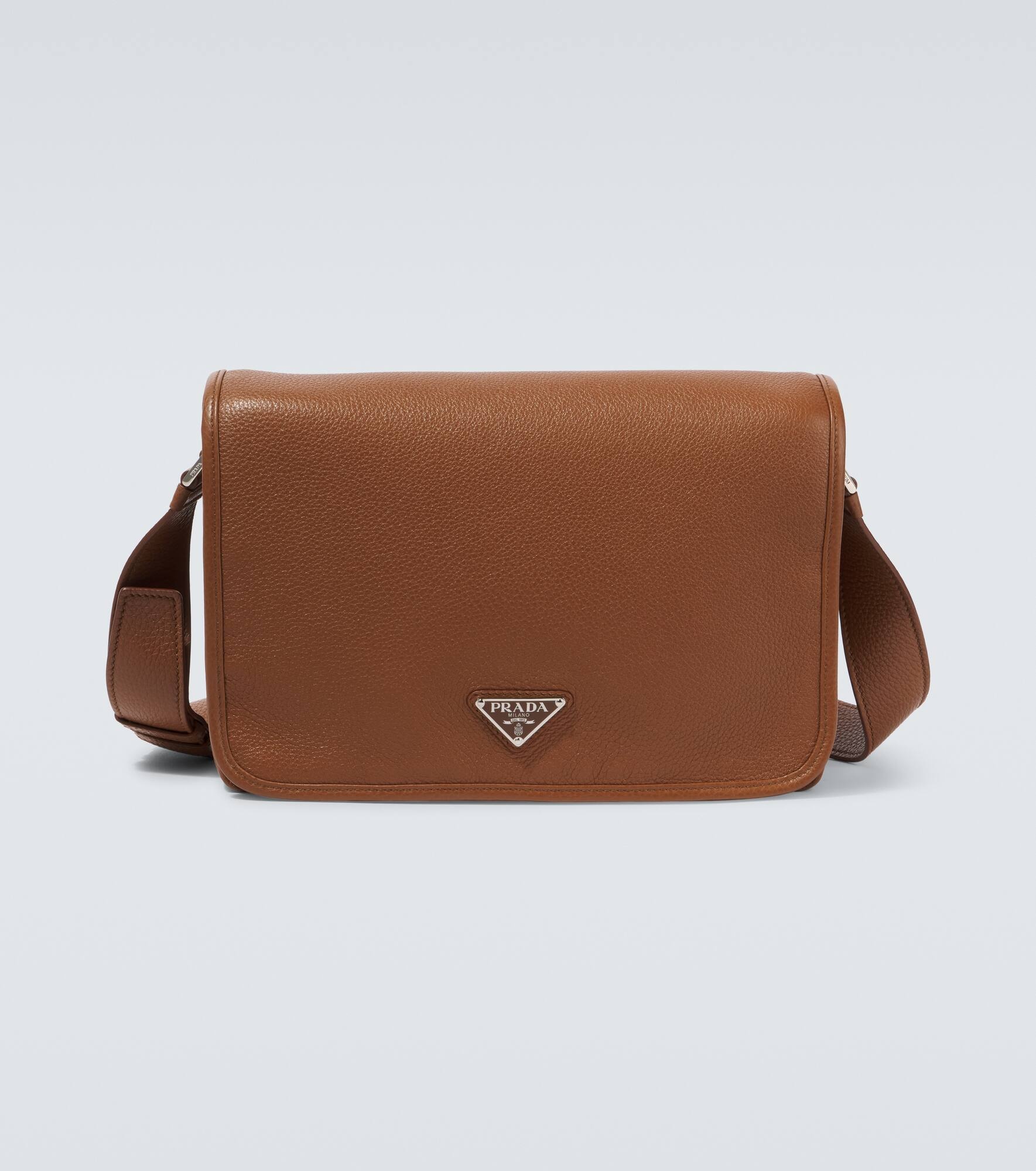 Prada takes Italian heritage into a distinctly modern direction with a streamlined and fashion-forward approach. Crafted from brown leather, this bag has an adjustable shoulder strap, a back zip pocket, and comes adorned with the distinctive triangle logo. Product Details - Material: leather - Lining: leather - Made in Italy - Designer color name: Cognac - Item color: brown - Internal details: internal slot pocket, internal zipped pockets - Closure: magnetic fastening - Adjustable shoulder strap - Hardware color: silver - Zipped back pocket - Item number: P01060648 Size & Fit - Height 20cm-8" - Width 29.5cm-11.5" - Depth 8.5cm-3.5" - Adjustable shoulder strap - Max. length shoulder strap 123cm-48.5"