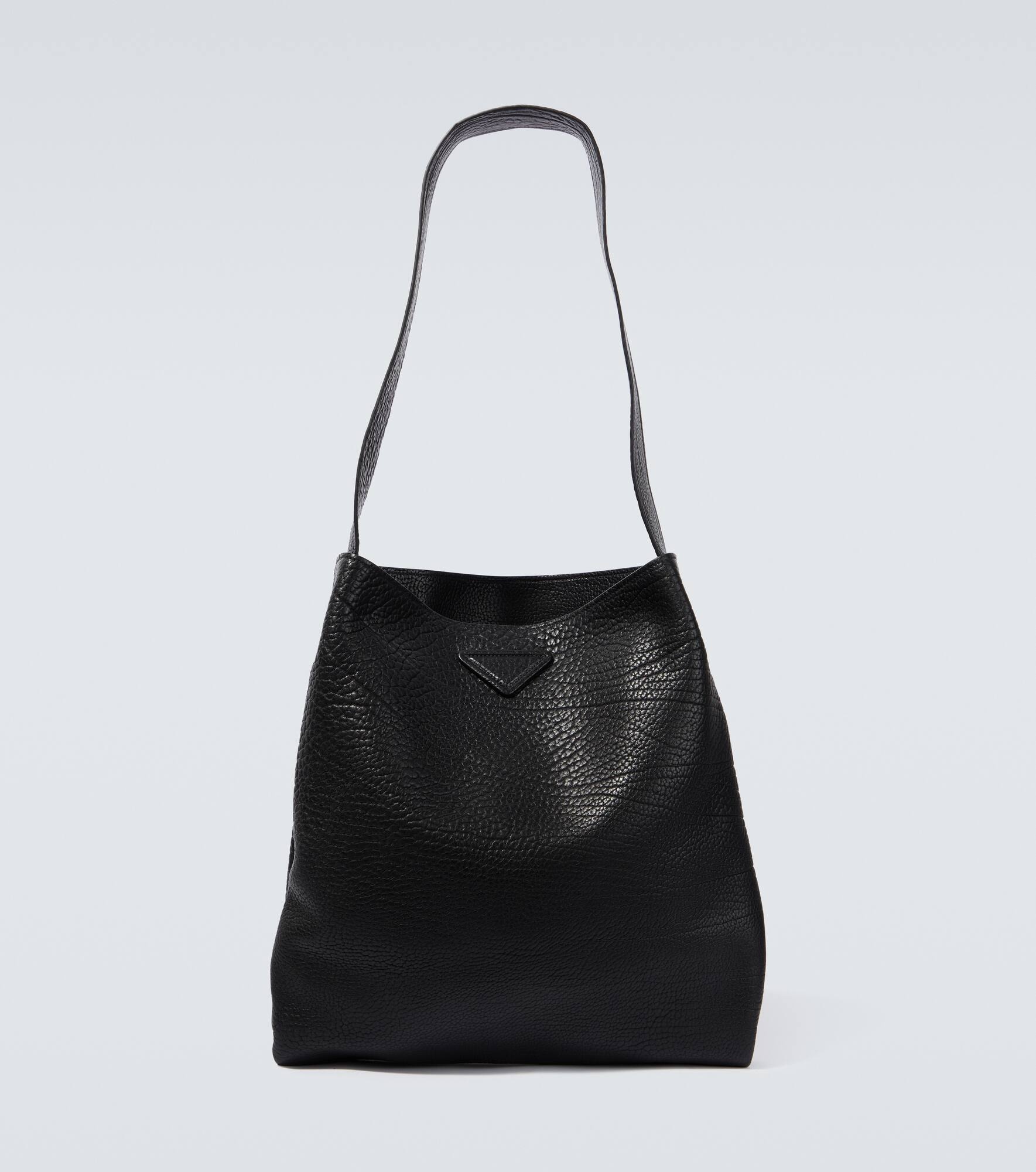 Prada's signature spazzolato calfskin is a full grain leather that's brushed to a high shine. This shoulder bag has a simplified design that's detailed with a plain triangular emblem and a singular shoulder strap. Product Details - Internal details: fabric lining, internal zipped pocket - Made in Italy - Designer color name: Nero - Leather shoulder strap - Material: calf leather - Closure: open top - Item number: P00758818 Size & Fit - Height 46cm-18" - Width 40cm-15.5" - Max. depth 7cm-3" - Length shoulder strap 91cm-36"
