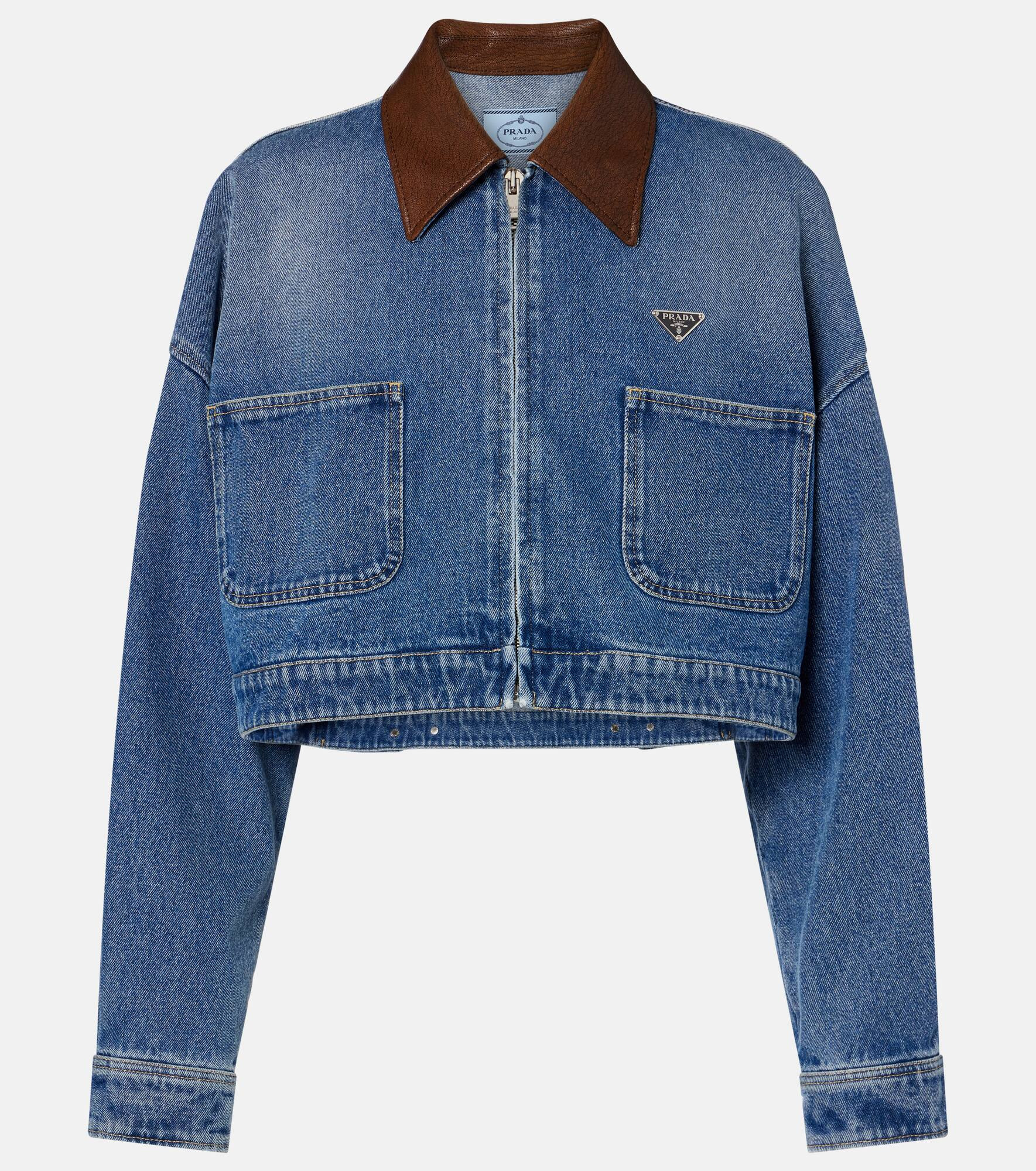 This denim jacket is an elevated classic with a contemporary design and sophisticated details. Featuring a leather collar and cropped silhouette, the design is complete with Prada's enameled metal triangle logo for a signature touch. Product Details - Material: 100% cotton - Care instructions: specialist clean - Made in Romania - Designer color name: Light Blue - Item color: blue - Details: 100% goat leather - Closure: zipped front - Pockets: patch pockets - Adjustable tabs at the waist - Cuff: buttoned - Contains non-textile parts of animal origin - Item number: P01061931 Size & Fit - True to size - Dropped shoulders - Oversized - Non-stretchy fabric - Cropped - The model seen in the picture is 178cm-5'10" and wearing a size IT 40