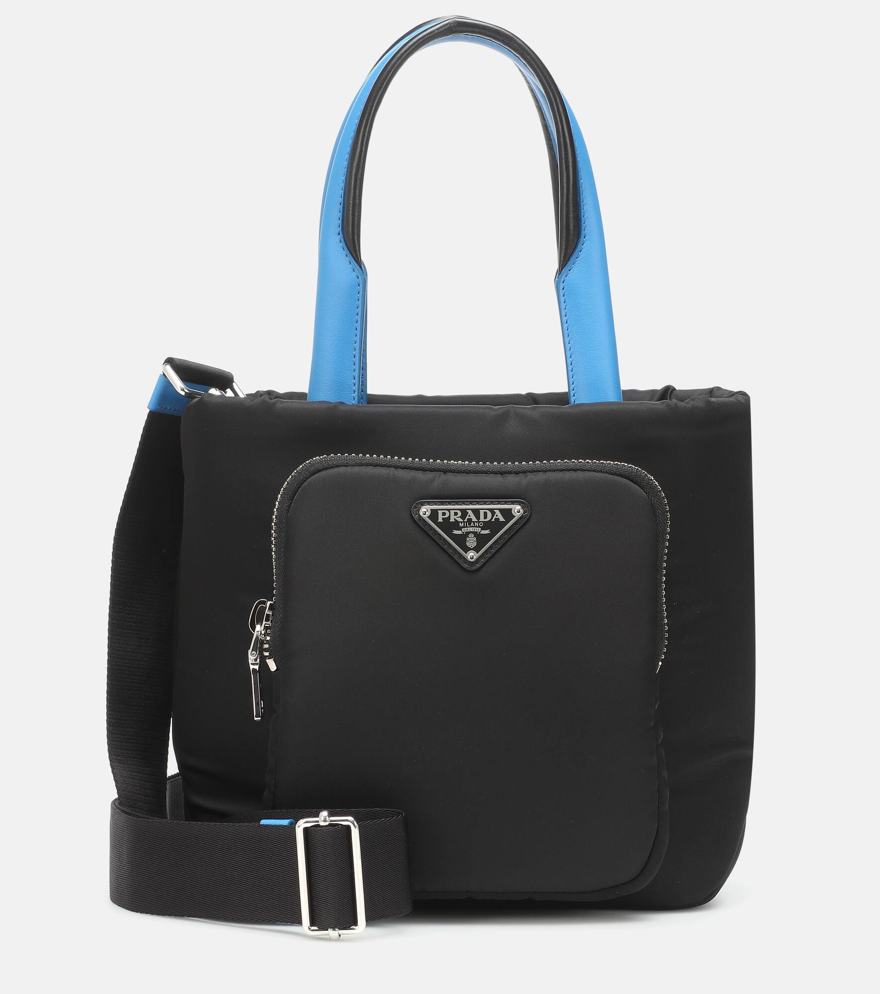 Blue leather top handles adorn this petite tote from Prada, made from the label's signature nylon fabric. Crafted in Italy, the scaled-down design has two exterior pockets with silver-toned zips and a spacious interior pocket that is lined in a coordinating blue shade. Product Details - Made in Italy - Color of fastening: silver - Designer color name: Nero+Marea - Closure: zipped top - Material: fabric - Detachable, adjustable shoulder strap, Top handles - Internal details: fabric lining - Trim: leather - Zipped front and back pockets - Item number: P00402925 Size & Fit - Height 21cm-8.5" - Width 25cm-10" - Depth 9cm-3.5" - Min. length shoulder strap 66cm-26" - Max. length shoulder strap 115cm-45.5"