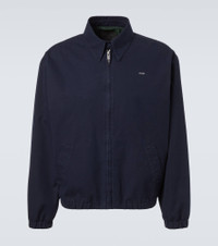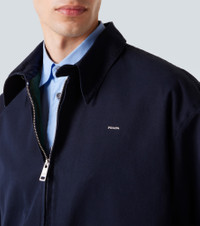 Prada takes Italian heritage into a distinctly modern direction with a streamlined and fashion-forward approach. Crafted from lightweight cotton, this blouson jacket features a subtle embroidered logo, a classic point collar, and welt pockets. Product Details - Material: 100% cotton - Care instructions: hand wash - Made in Italy - Designer color name: Blue+Biliardo - Item color: blue - Lining: 100% cotton - Contains non-textile parts of animal origin - Closure: zipped front - Pockets: welt pockets - Collar: classic (Straight point) - Hem: elasticated - Item number: P01093733 Size & Fit - True to size - Dropped shoulders - Designed for a loose fit - Elasticated hem - Non-stretchy fabric - Falls to the hip - The model in the picture is 185cm-6'1" and wearing a size IT 50