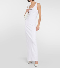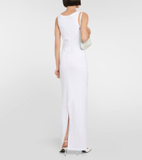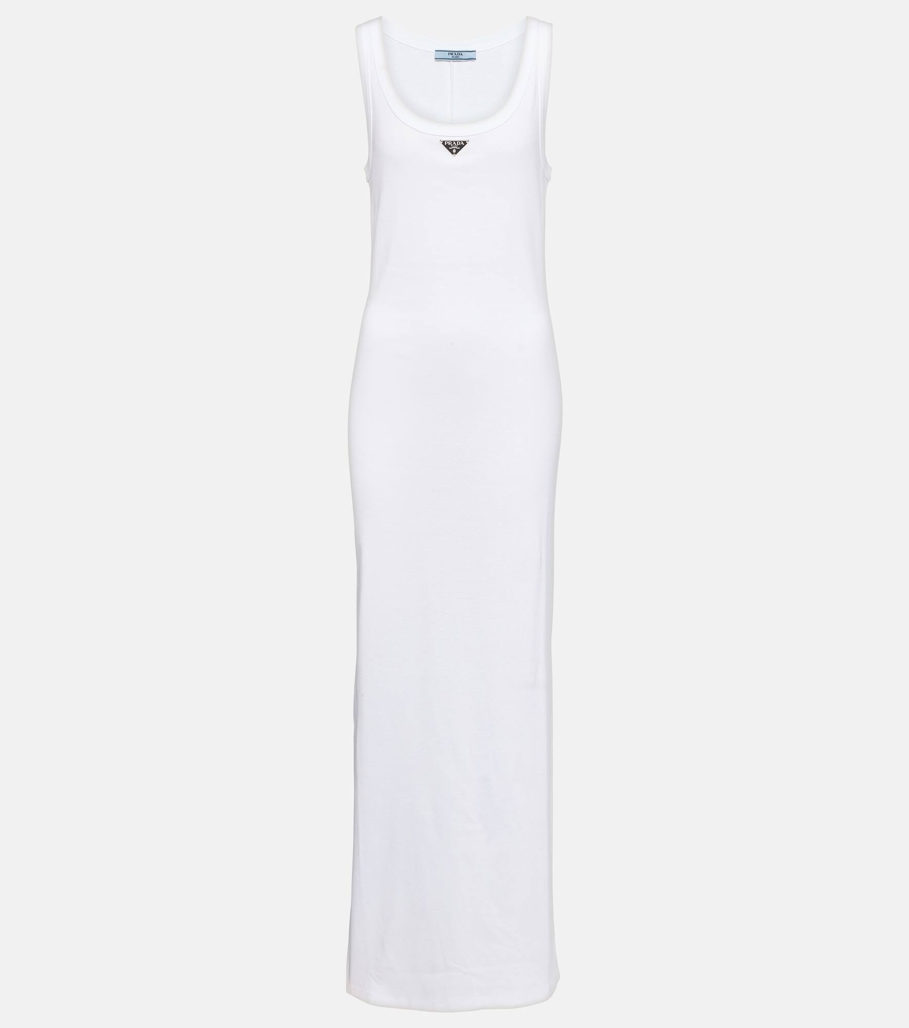 Level up your staples edit with this maxi dress from Prada. Made from cotton jersey, this minimalist yet iconic style has a fitted silhouette and features the label’s coveted triangular metal logo plaque on the chest. Product Details - Made in Italy - Care instructions: machine wash at 30 degrees - Material: 100% cotton - Designer color name: Bianco - Item number: P00821623 Size & Fit - Fits large to size - we recommend trying one size smaller - Cinched waist - Stretchy fabric - slit length 50cm-19.5" - The model seen in the picture is 178cm-5'10" and wearing a size IT 38