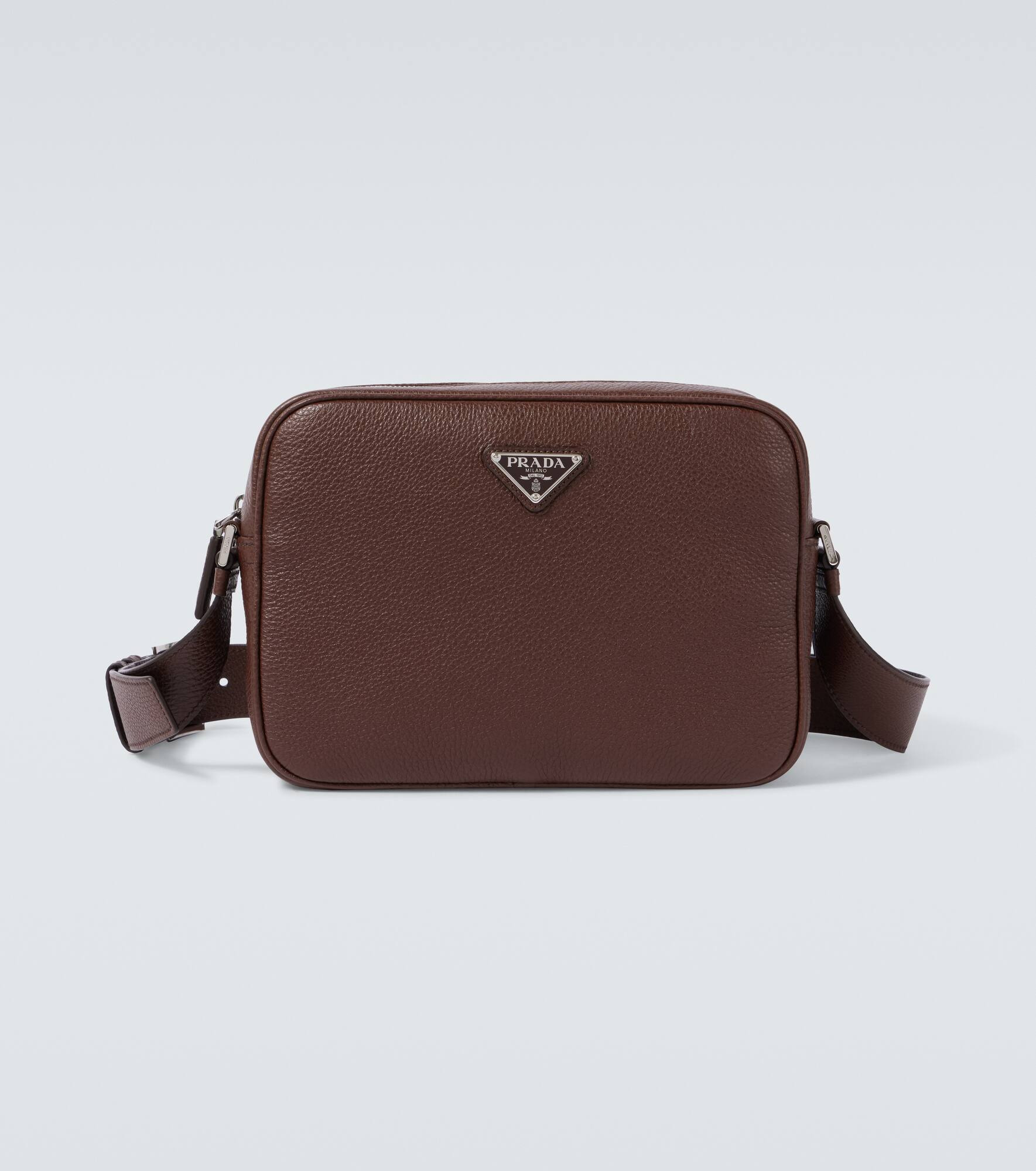 Prada takes Italian heritage into a distinctly modern direction with a streamlined and fashion-forward approach. Crafted from supple leather, this shoulder bag features an adjustable shoulder strap, silver-tone hardware, and the brand's signature triangle logo. Product Details - Material: calf leather - Lining: nylon - Made in Italy - Designer color name: Bruciato - Item color: brown - Includes: dust bag - Closure: zipped top - Adjustable shoulder strap - Internal details: internal zipped pocket - Item number: P01060649 Size & Fit - Height 18cm-7" - Width 25cm-10" - Depth 7.5cm-3" - Adjustable shoulder strap - Max. length shoulder strap 129cm-51"