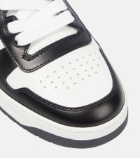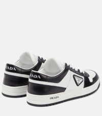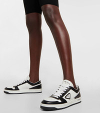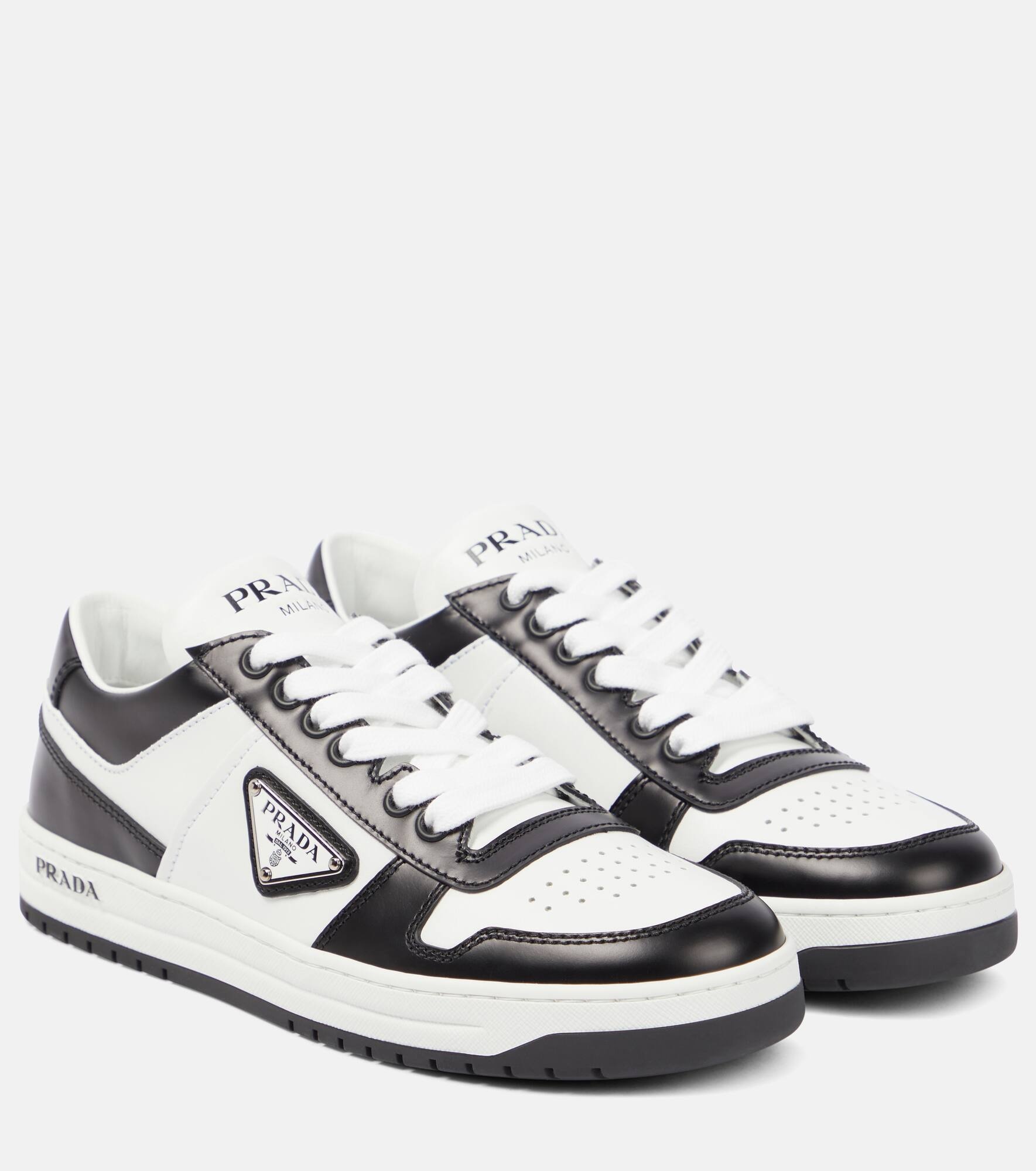 These sneakers from Prada are made from black and white leather panels with perforated detailing. The low-top silhouette is branded with the signature triangle patch on the sides and lettering print on the tongues and heels. Product Details - Lining: cow leather, fabric - Sole: leather insole, rubber sole - Upper: cow leather - Toe shape: round toe - Comes with a box - Designer color name: Bianco+Nero - Closure: lace-up - Made in Italy - Item number: P00695422 Size & Fit - True to size - Slightly narrow - European sizes - 2,5cm-1" platform (size EU 38) - 3cm-1" wedge heel (size EU 38)