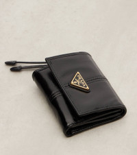 This leather wallet is made in Italy and designed for a timeless, sophisticated impact. Prada's triangle logo pays tribute to the brand's long-standing connection to the Italian royal family, the House of Savoy. Product Details - Material: leather - Lining: leather, fabric - Made in Italy - Designer color name: Black - Item color: black - Internal details: snap-buttoned coin pocket, Card slots, bill slot - Closure: snap-buttoned fastening - Includes: box - Item number: P01083913 Size & Fit - Height 8cm-3" - Width 10cm-4"