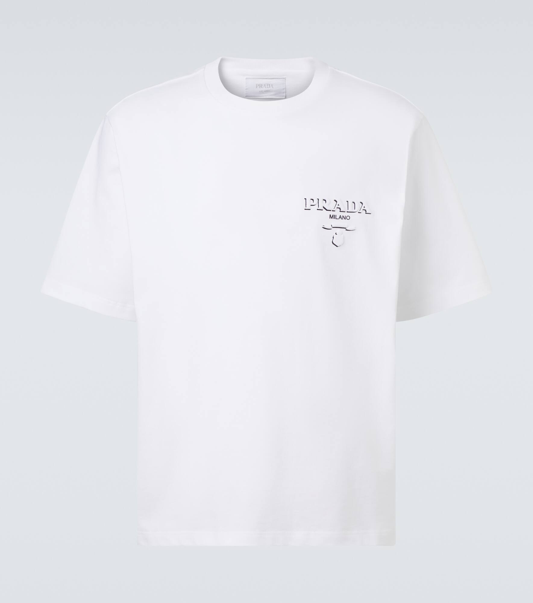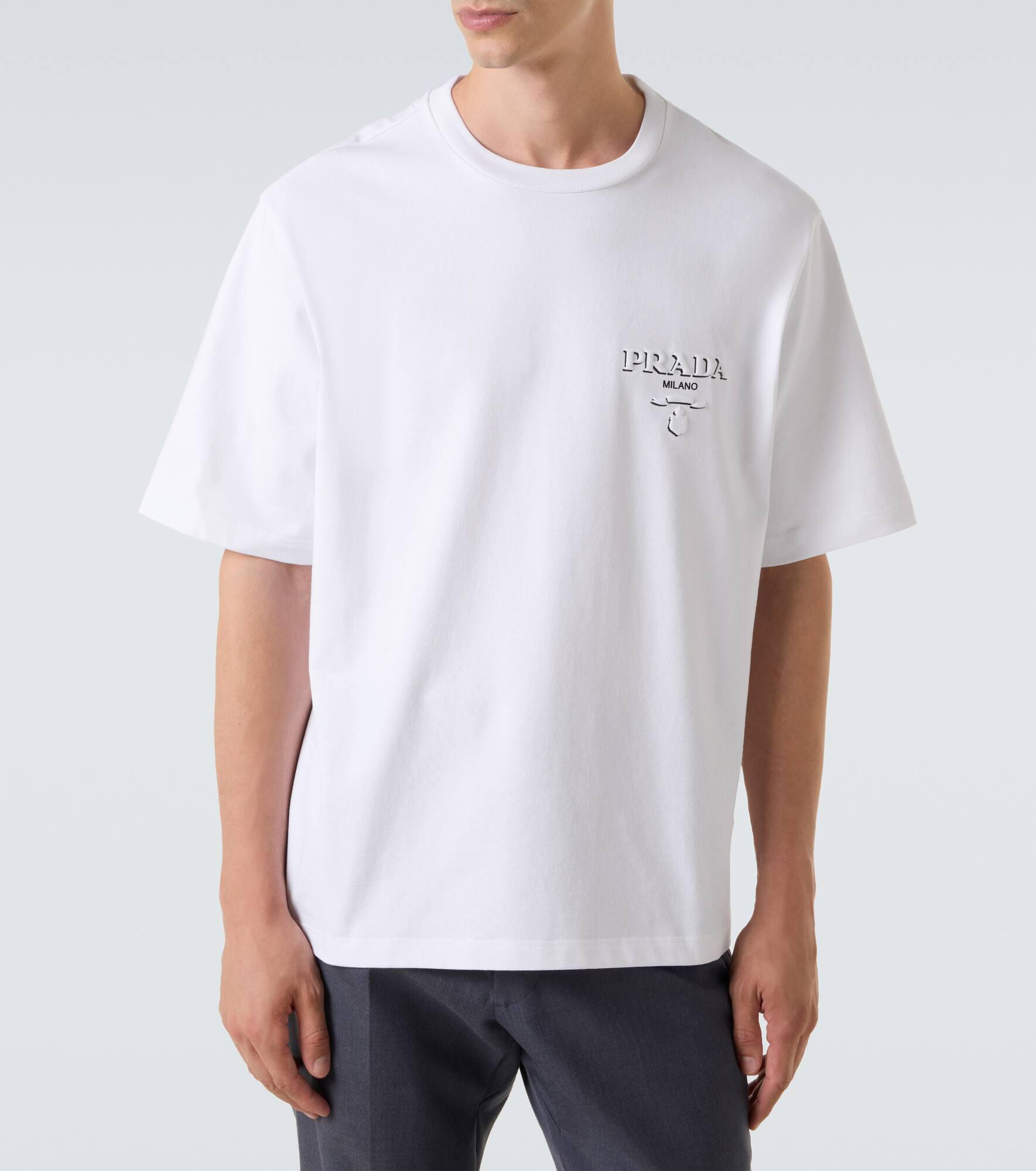 Prada takes Italian heritage into a distinctly modern direction with a streamlined and fashion-forward approach. Crafted from soft cotton jersey, this oversized T-shirt is defined by a three-dimensional effect logo at the chest. Product Details - Material: 100% cotton - Care instructions: machine wash at 30 degrees - Made in Romania - Designer color name: Bianco - Item color: white - Collar: crewneck - Item number: P01060804 Size & Fit - True to size - Dropped shoulders - Designed for a loose fit - Slightly stretchy fabric - Falls to the hip - Height of model is 189cm-74.5" and wears a size L
