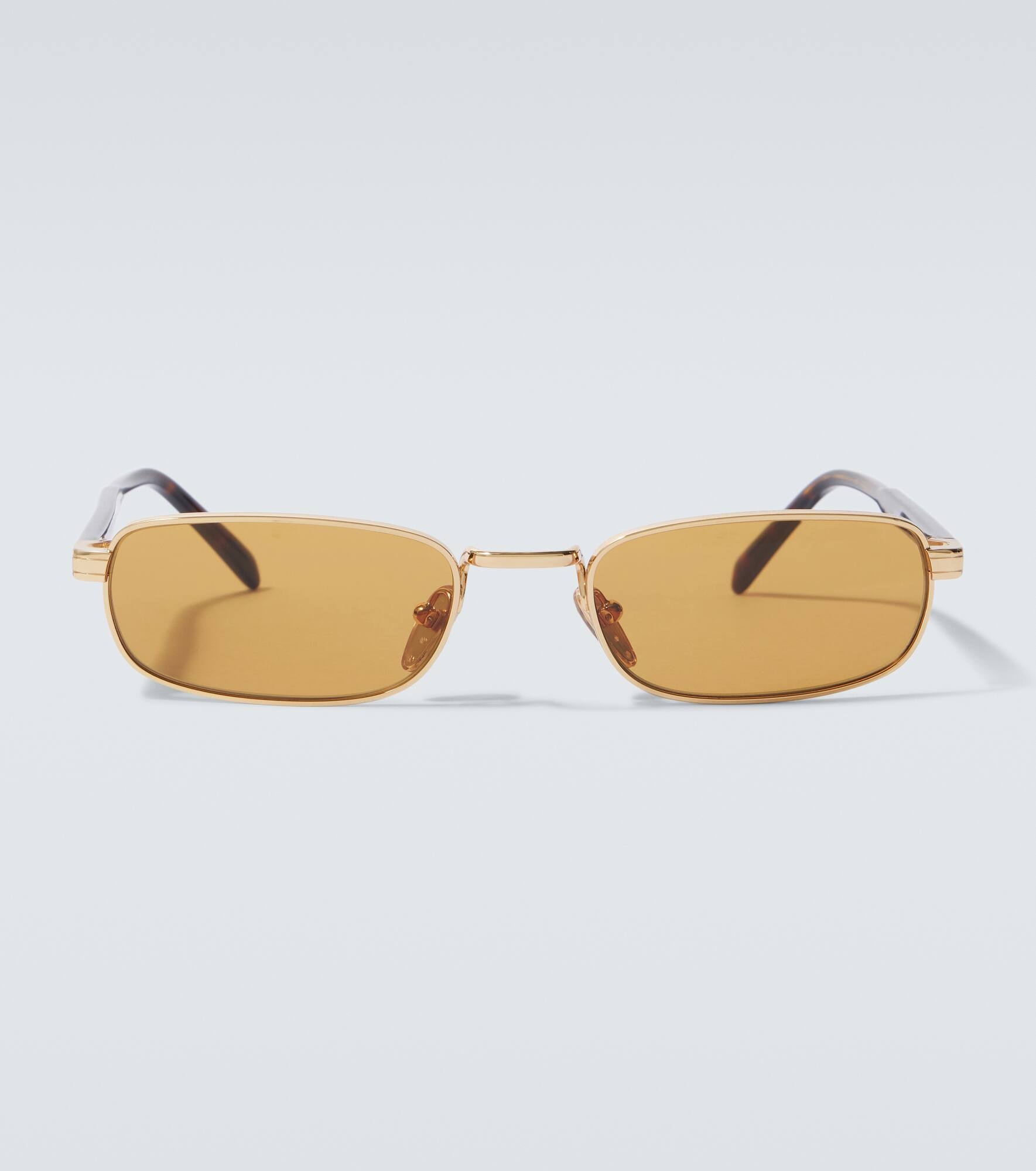 These rectangular sunglasses from Prada feature a sleek, cool silhouette perfect for warm-weather days. The design is completed with the brand's logo engraved on the temples. Product Details - Frame material: metal - Frame color: gold, tortoiseshell - Lens filter category 2 - Lens color: golden yellow - Made in Italy - Includes: case and presentation box - Designer color name: Gold Dark Honey - The color of the case may vary - Item number: P00995942 Size & Fit - Lens width: 54mm-2.15" - Bridge size: 20mm-0.8" - Earpiece length: 145mm-5.7"