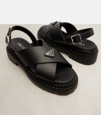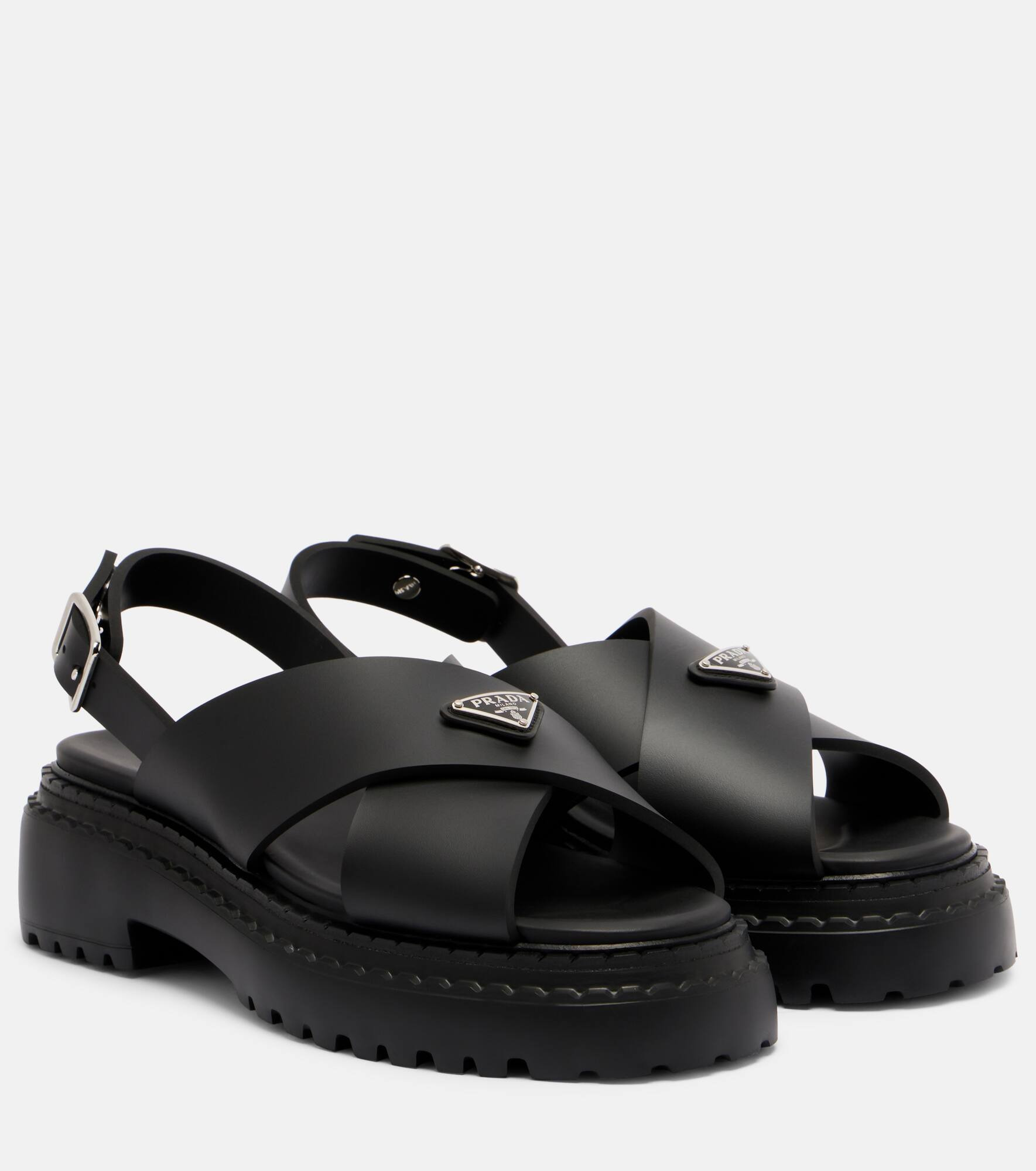 Prada's triangle logo pays tribute to the brand's long-standing connection the House of Savoy. Featuring the iconic detailing on the uppers, these rubber sandals feature buckle fastenings and platforms for added height. Product Details - Upper: rubber - Lining: rubber - Sole: leather insole, rubber sole - Toe shape: almond open toe - Made in Italy - Includes: shoe box - Designer color name: Black - Item color: black - Hardware color: silver - Item number: P01084090 Size & Fit - True to size - European sizes - 6,5cm-2.5" heel (size EU 38) - 4,5cm-2" platform (size EU 38)