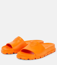 These orange pool slides are the perfect summer shoe for the Prada fan. Embossed with the triangle logo on the straps, they're made from Extralight® rubber that feels virtually weightless. Product Details - Toe shape: round open toe - Lining: rubber - Upper: rubber - Comes with a box - Made in Italy - Designer color name: Papaya - Sole: rubber insole and sole - Item number: P00618580 Size & Fit - True to size - Half sizes please take the next size down - European sizes - 3cm-1" platform (size EU 38) - 4cm-1.5" wedge heel (size EU 38)