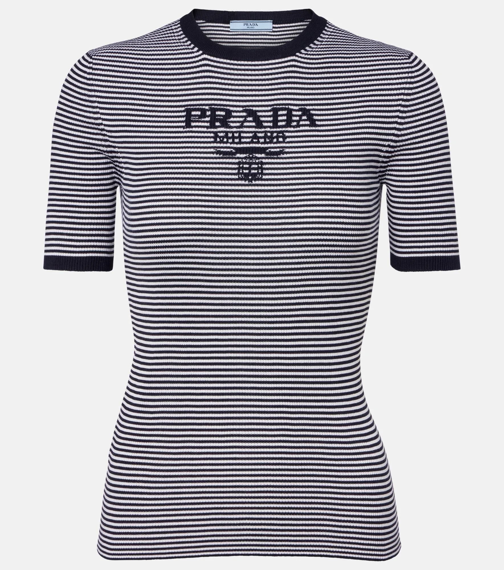 Prada takes Italian heritage into a distinctly modern direction with a streamlined and fashion-forward approach. This short-sleeved sweater is expertly crafted from pure silk and finished with a striped pattern and a front logo. Product Details - Material: 100% silk (recycled) - Care instructions: dry clean - Made in Italy - Color: blue - Designer color name: Blu+Bianco - Collar: crewneck - Item number: P01172333 Size & Fit - True to size - Fitted - Stretchy fabric - Falls to the hip - The model seen in the picture is 178cm-5'10" and wearing a size IT 40