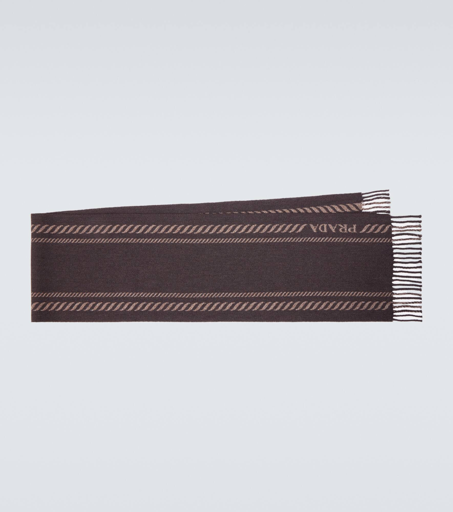 Prada takes Italian heritage into a distinctly modern direction with a streamlined and fashion-forward approach. This fringed scarf is made from wool and cashmere and features a logo design along the sides. Product Details - Material: 90% wool, 10% cashmere - Care instructions: dry clean - Made in Italy - Designer color name: Ebano - Item color: brown - Item number: P01060738 Size & Fit - Length 182cm-71.5" - Width 28cm-11" - Length of fringe 8cm-3"