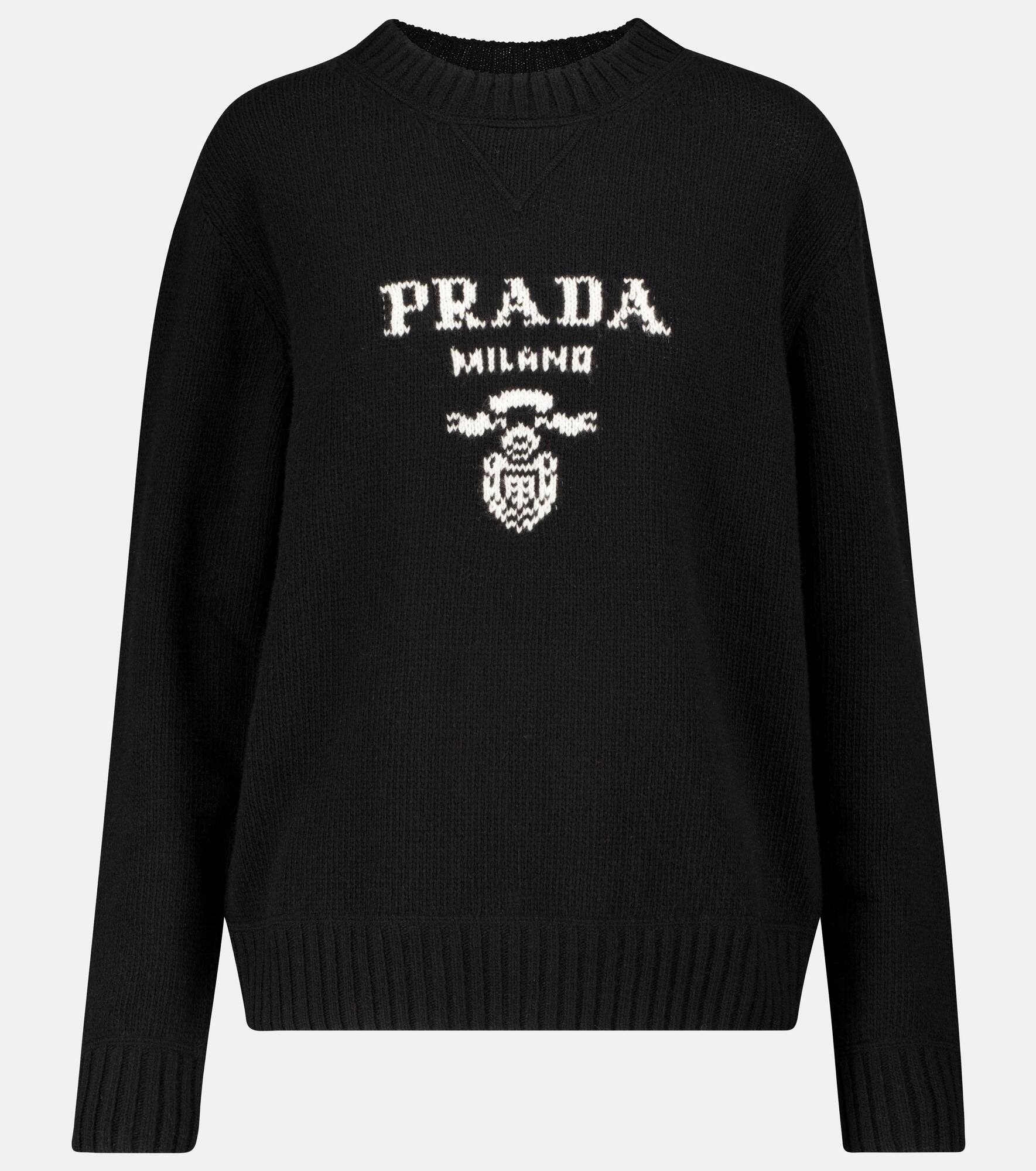 We find this black Prada sweater captivating because of its clever design – it's a knit style that mimics classic sweatshirts. It has a crew-neck and slightly off-shoulder sleeves, details that lend this wool and cashmere-blend piece a casual air. The Italian powerhouse's logo intarsia completes it on a polished note. Product Details - Material: 70% wool, 30% cashmere - Care instructions: dry clean - Made in Italy - Designer color name: Black - Item color: black - Item number: P00528292 Size & Fit - True to size - Dropped shoulders - Designed for a loose fit - Slightly stretchy fabric - Falls below the hip - The model seen in the picture is 178cm-5'10" and wearing a size IT 40