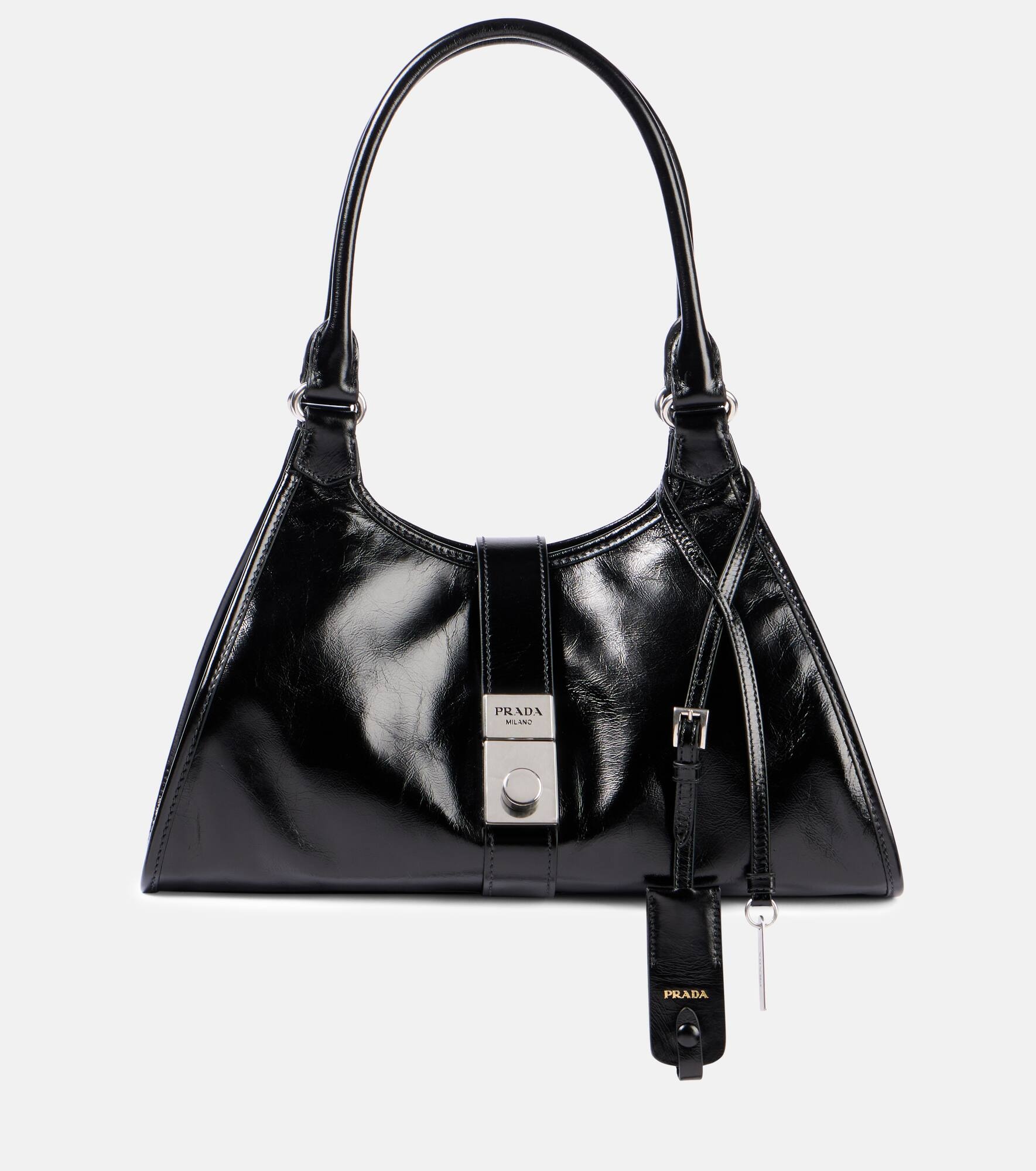 Prada takes Italian heritage into a distinctly modern direction with a streamlined and fashion-forward approach. Defined by sleek lines, this Medium bag is crafted from supple leather with long shoulder straps. Product Details - Material: leather - Lining: leather - Made in Italy - Designer color name: Nero - Item color: black - Hardware color: silver - Internal details: internal zipped pocket - Top handles - Closure: turn-lock fastening - Item number: P01016734 Size & Fit - Height 16cm-6.5" - Min. width 21cm-8.5" - Max. width 31cm-12" - Depth 14cm-5.5" - Length of handles 46cm-18"